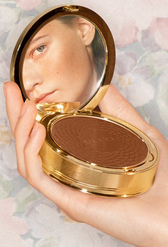 Звезда летней коллекции макияжа Gucci — Poudre De Beauté Éclat Soleil в «старинном» золотом футляре. Эта пудра-бронзер с приятным сиянием так и просится подсветить скулы, лоб, ключицы и декольте перед ужином в Cafe de Paris. Заодно средство маскирует несовершенства и визуально корректирует овал лица.