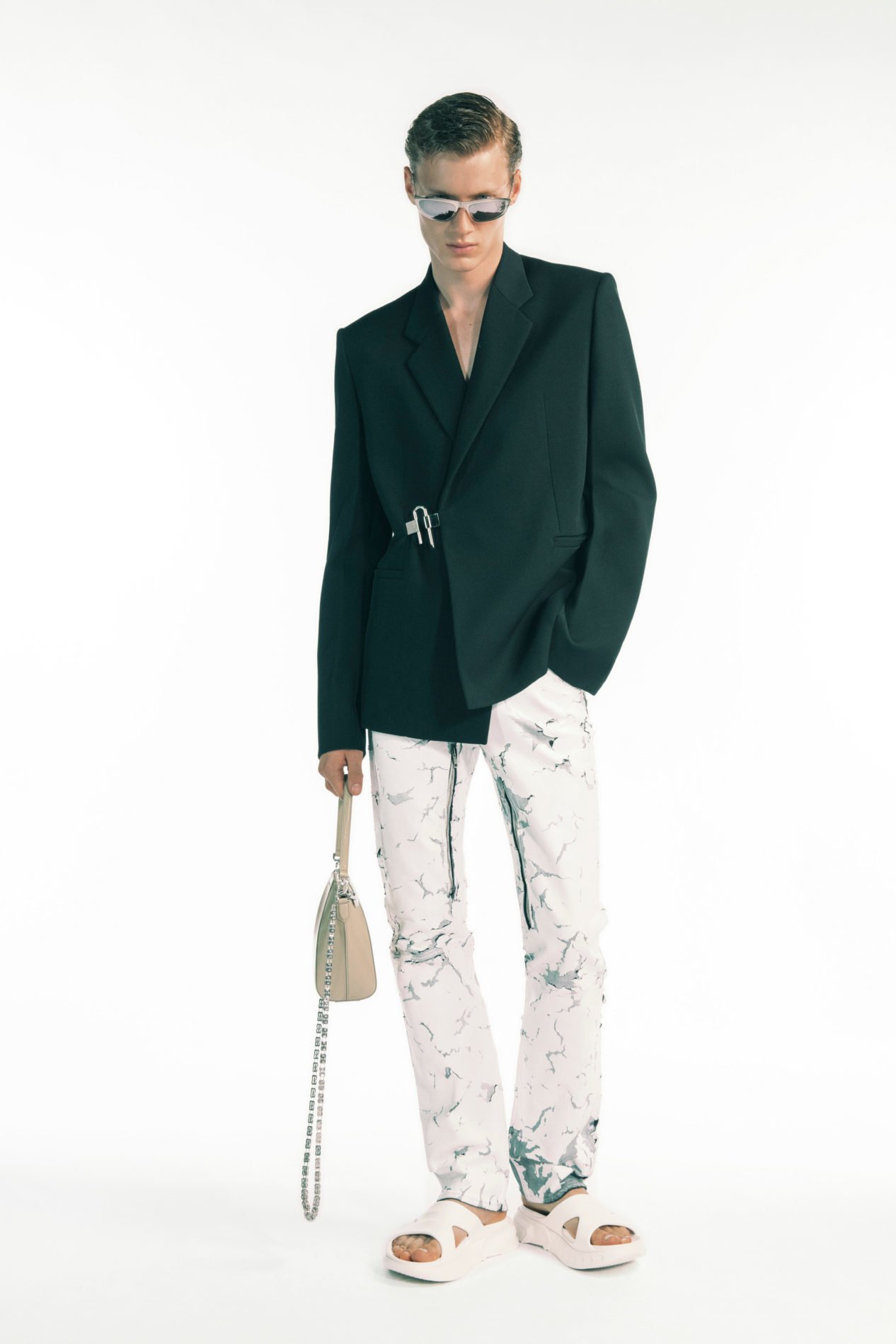 Жизнь современного денди без пиджака немыслима. Но важно понимать, что и в этих крепких отношениях есть четкая градация. Днем в офис — исключительно спокойная выдержанная классика, для вечера — в меру нарядные модели. Что остается повседневным пиджакам? Удивлять интересными деталями и неожиданными акцентами. У Givenchy это застежка, стилизованная под дужку замка, вместо пуговиц. У Alexander McQueen и Casablanca — сочетание двух цветов в одной модели. А у Off-White и Dsquared2 — модели, которые выглядят небанально за счет «промышленных» поясов и ремешков.