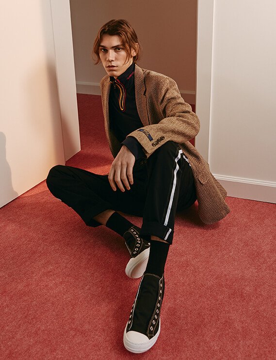 Пиджак, Ralph Lauren, 45 300 руб., пуловер, CALVIN KLEIN 205W39NYC, 39 950 руб., брюки, Ralph Lauren, 12 650 руб., кеды, Maison Margiela, 24 900 руб.