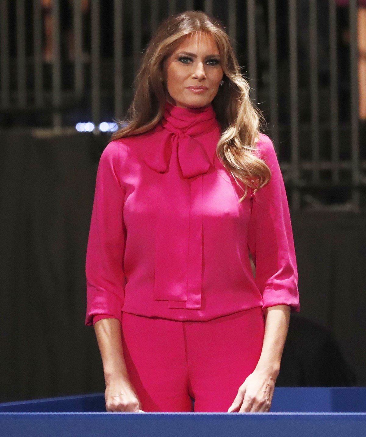 Первая леди США носит блузы с бантом на манер Маргарет Тэтчер — застегнутыми под горло в дуэте с деловым костюмом или брюками в тон.