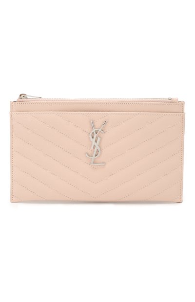 Пудровый футляр изготовили из мягкой матовой кожи со стеганым шевронным мотивом. Аксессуар, закрывающийся молнией, дополнили открытым накладным карманом на задней панели. Изделие декорировали знаковой серебристой монограммой Кассандра, составленной из инициалов Ива Сен-Лорана.