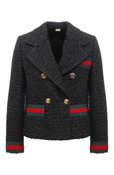 Серый жакет из весенне-летней коллекции – яркий пример эстетики марки, основанной Гуччио Гуччи. Двубортную модель с широкими лацканами сшили из фактурного смесового твида с неброским меланжевым эффектом, а яркие акценты расставили знаковыми красно-зелеными лентами Web на манжетах и карманах. Легкий блеск изделию добавили золотистые пуговицы с тисненой GG-монограммой.