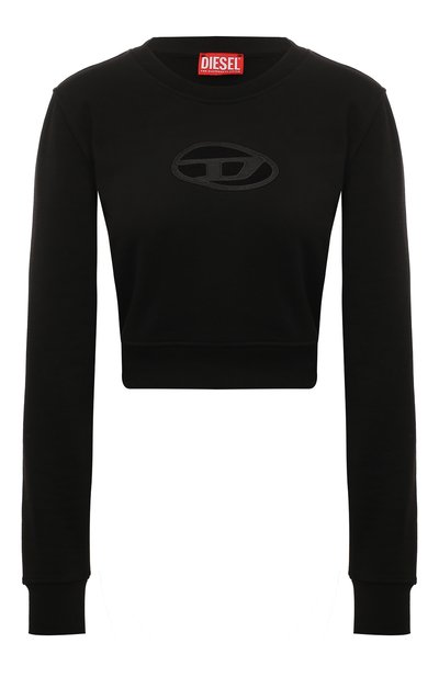 Для создания черного укороченного свитшота выбрали мягкий приятный на ощупь трикотаж, не препятствующий циркуляции воздуха. В пряже объединили органический хлопок, выращенный без применения пестицидов, и гладкий нейлон из переработанного пластикового мусора. Спереди модель декорировали крупной шелковистой вышивкой со знаковой литерой D, подчеркивающей принадлежность марке.