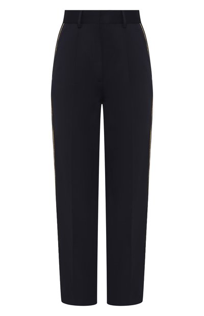 Укороченные темно-синие брюки, которые Томми Хилфигер включил в осенне-зимнюю коллекцию, украшены бархатными лампасами с золотистым кантом. Модель с высокой посадкой, четырьмя врезными карманами и стрелками сшита из почти немнущегося гладкого твила.
