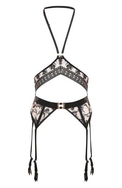 Для пошива двойного пояса использовали полупрозрачный эластичный тюль, расшитый узорами с цветочными и геометрическими мотивами. Атласные пажи, крепящиеся к чулкам, и бретель на шее регулируются слайдерами. Изделие, украшенное золотистыми пряжками спереди, застегивается крючками сзади.