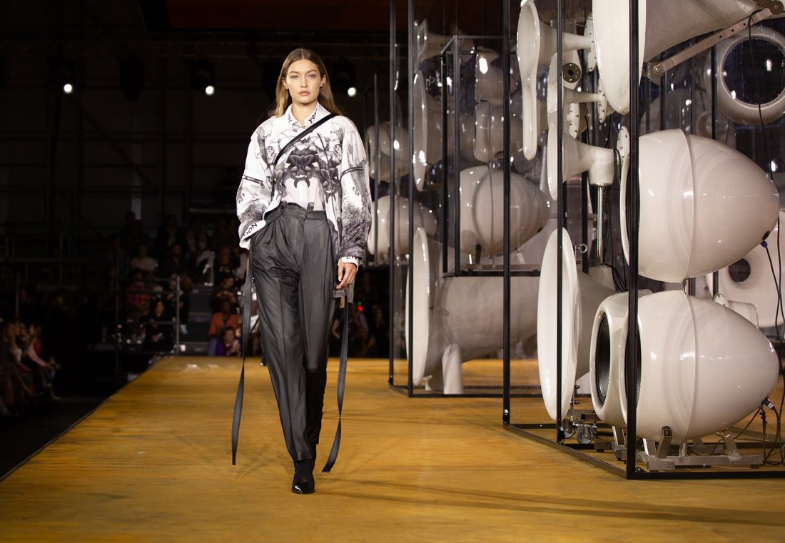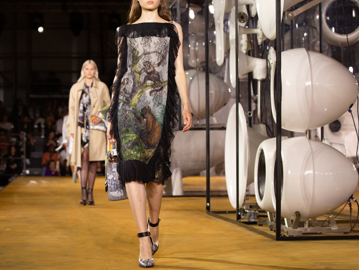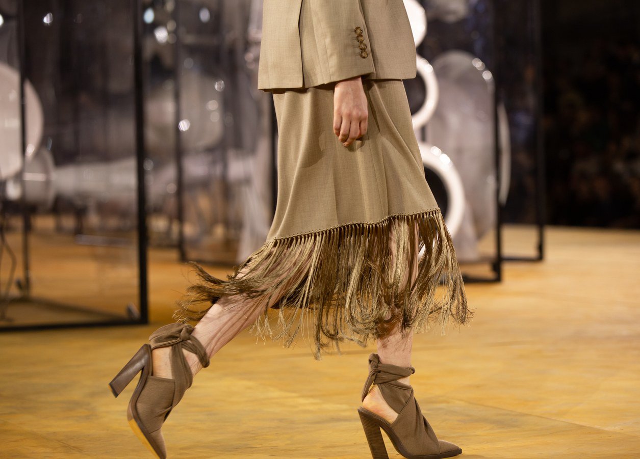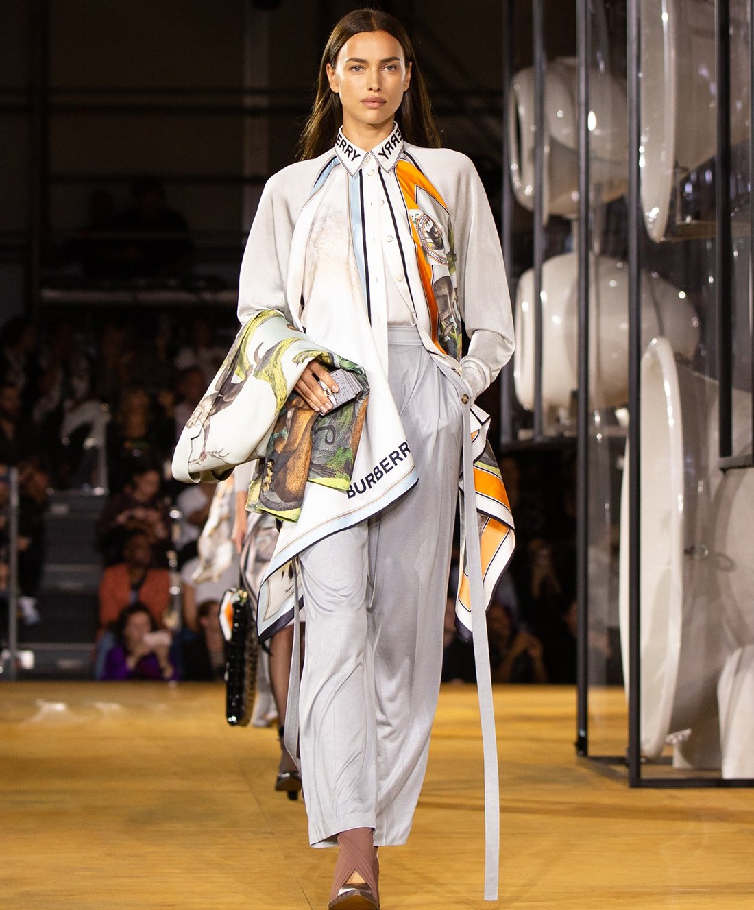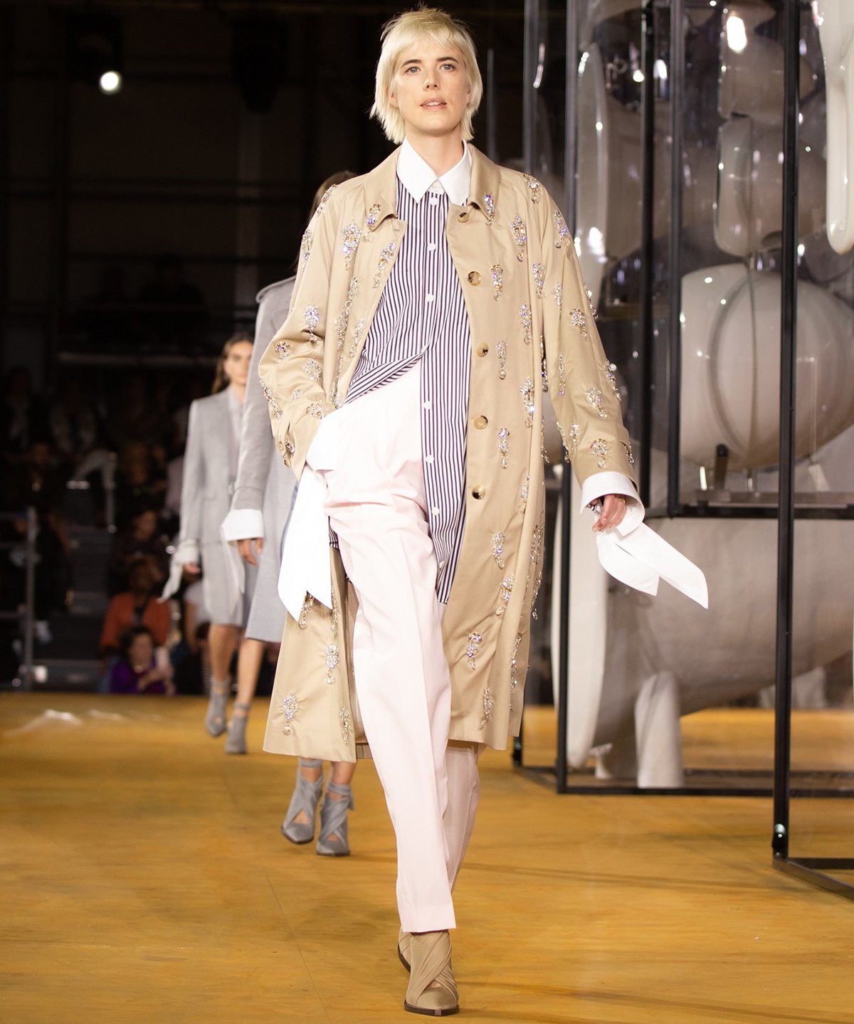 Весной 2020-го это будет выглядеть так: тренчи с отделкой из хрусталя, деловые костюмы с бахромой и ремнями, большие сумки с вырезанными ручками и шелк, расписанный на манер римских фресок.