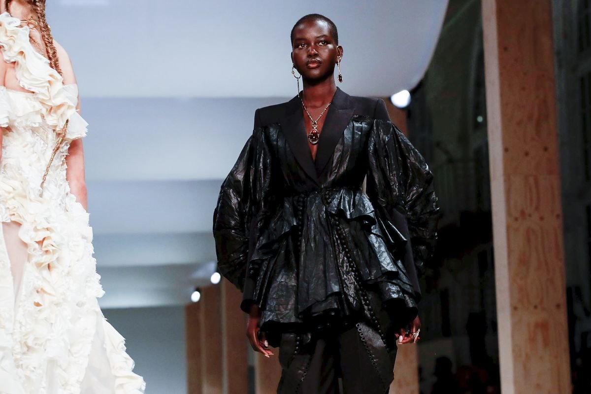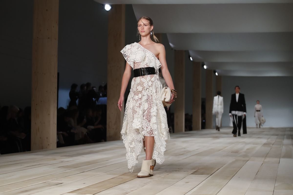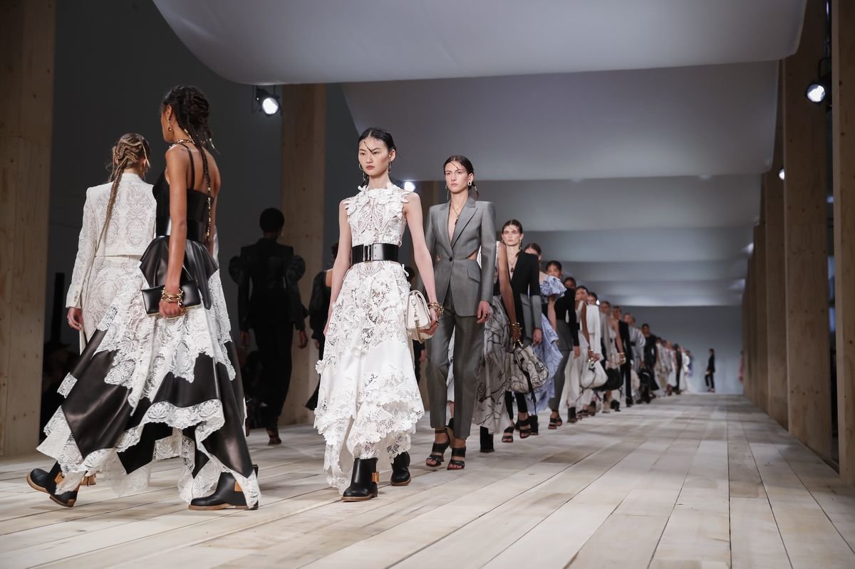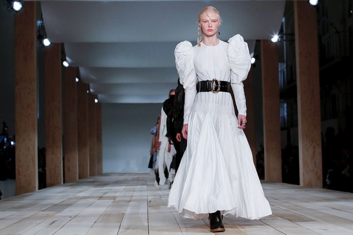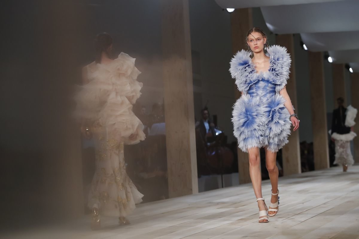 Сара Бертон продолжает удивлять. Если для создания осенне-зимней коллекции она вывезла всю свою команду в родной Маклсфилд, где познакомила ее со старинными британскими мануфактурами, то в рамках подготовки новой коллекции она пошла еще дальше. Весь персонал Alexander McQueen (не только дизайн-студия, но и даже отдел кадров) принял участие в создании платьев, которые сотрудники расшивали вручную! Очень вдохновляющая история единства подкреплялась и невероятно красивой одеждой: викторианскими платьями, приталенными жакетами с перфорацией, смокингами и брючными костюмами.