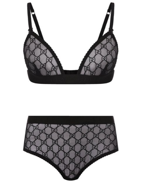 Черный комплект белья из новой коллекции Gucci засветился во всех глянцевых съемках сезона. Еще бы: узнаваемый паттерн GG Supreme, вышитый на тончайшем фатине, смотрится очень эффектно.