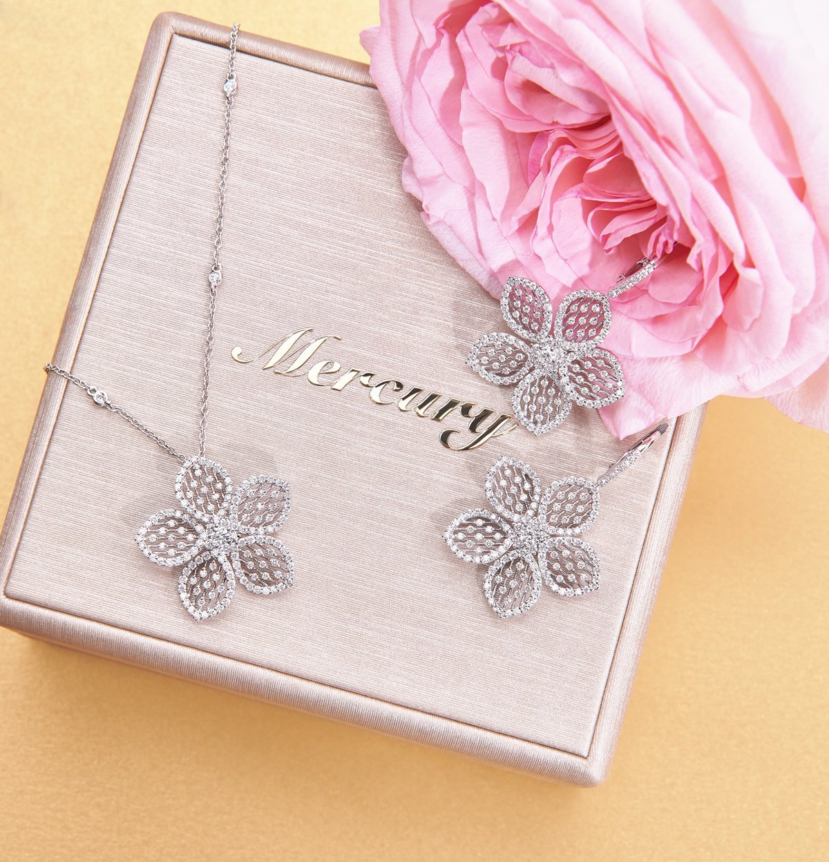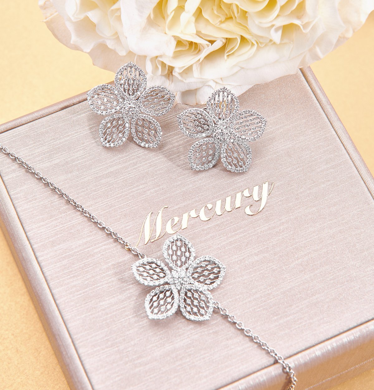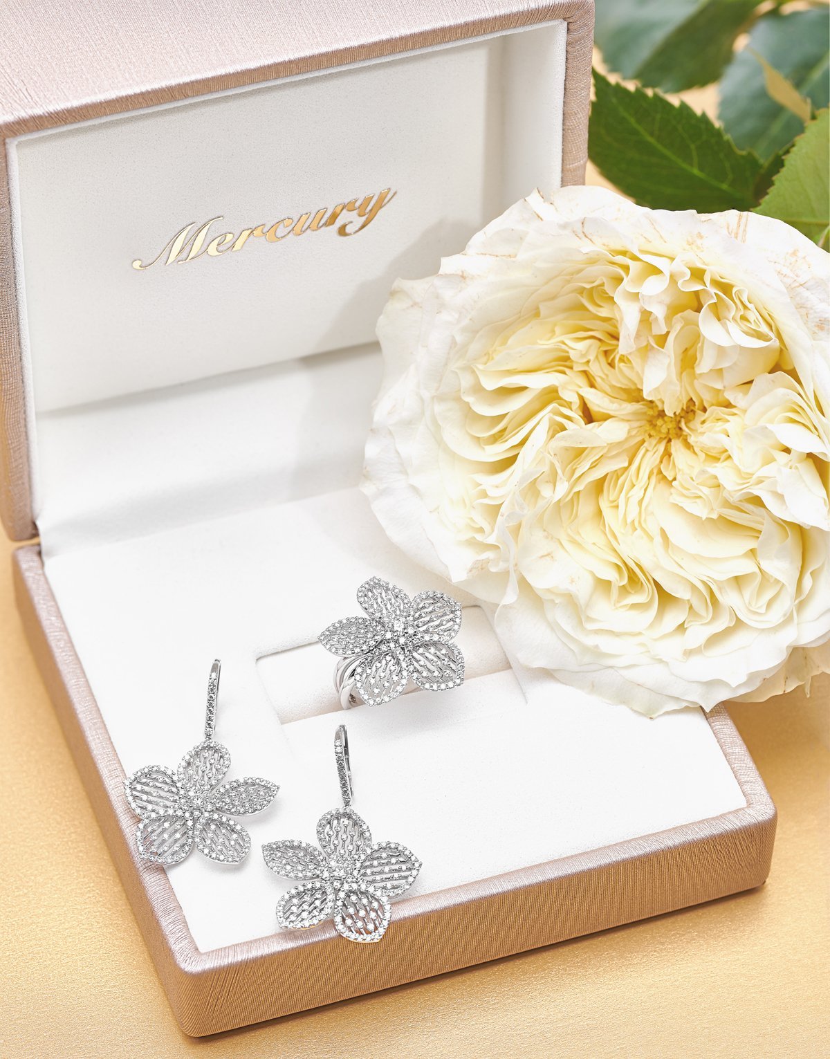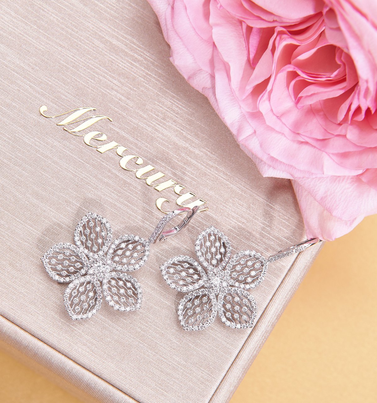 Особенно красиво мастера Mercury воплотили узор короны в украшениях в форме цветов. Лучшие бриллианты огранили и расположили так, чтобы они играли и «вибрировали» на свету. В итоге кажется, что лепестки, словно живые, слегка колышутся на ветру.