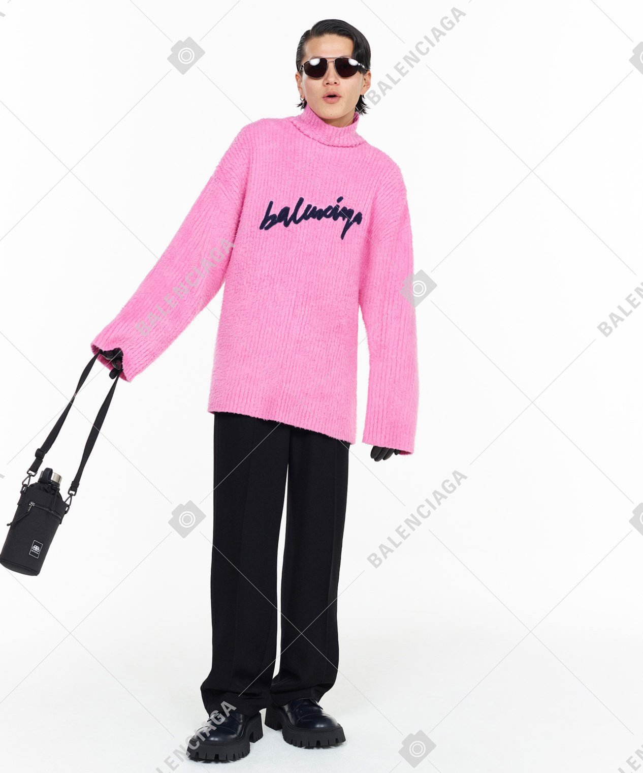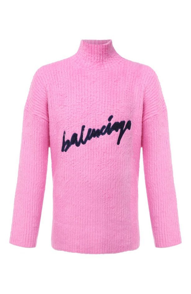 Ярко-розовый свитер с высоким горлом и лого бренда — самый заметный герой осенней коллекции Balenciaga. Как носить мужчине романтичный «девичий» цвет? В сочетании с «суровыми» пуховиками и лаконичными черными брюками, разумеется.