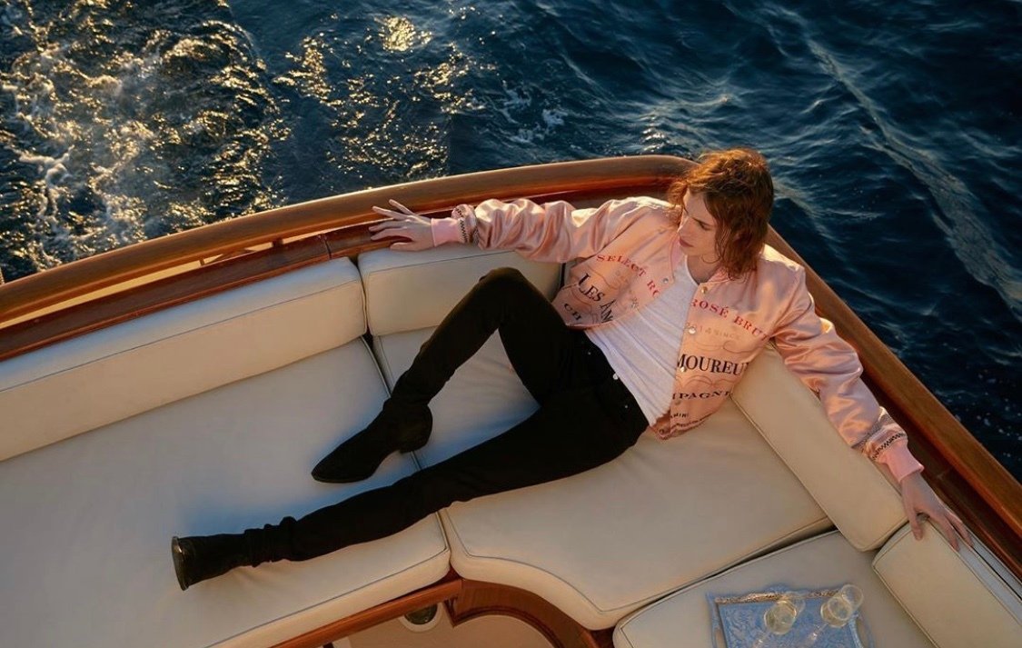 Ода гедонизму и роскошной жизни — так в целом можно описать осеннюю коллекцию Майка Амири. А квинтэссенцией гламура стал нежно-розовый шелковый бомбер с логотипом, похожим на этикетку дорогого шампанского.