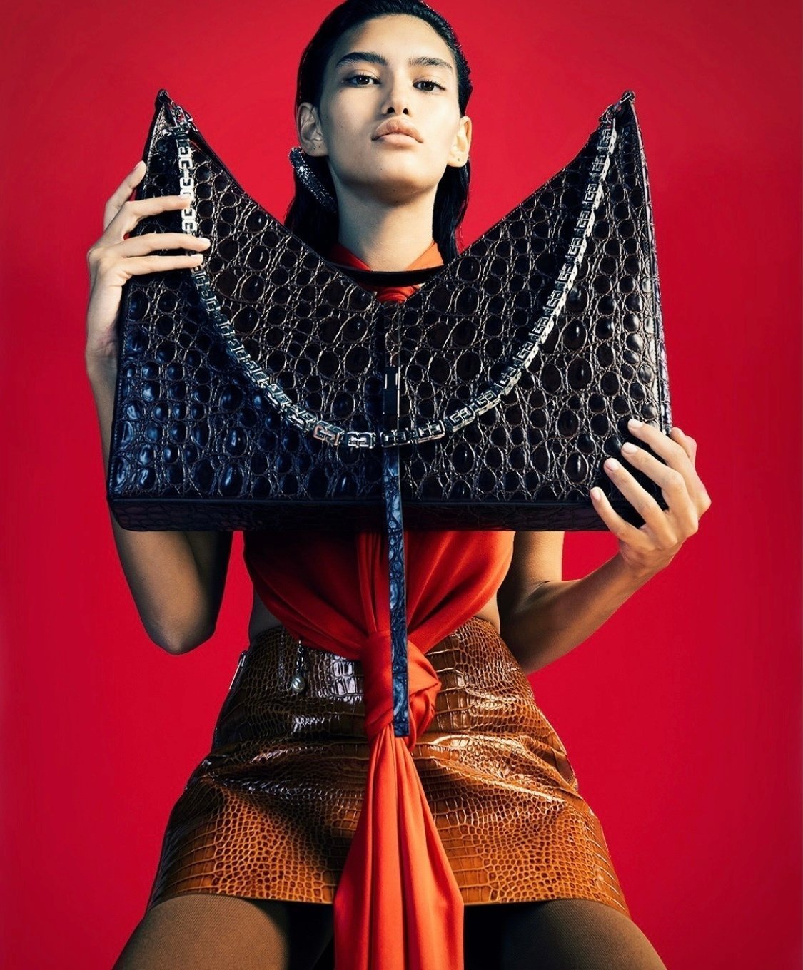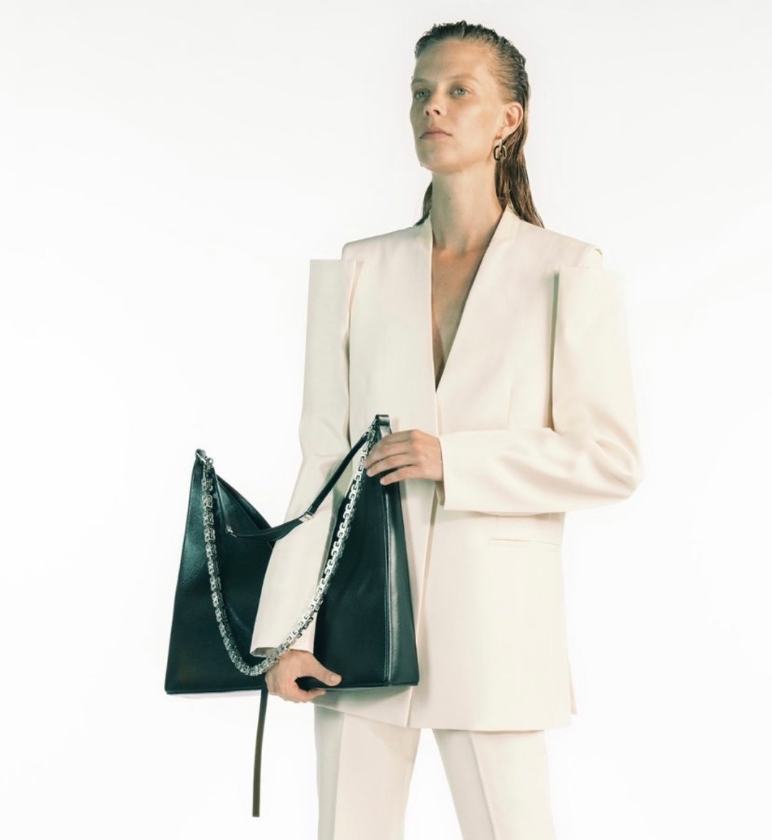 Креативный директор Givenchy Мэтью Уильямс блестяще справился с обеими задачами. Особенно громкой получилась премьера Cut-Out — сумки с сильным характером. Таковым аксессуар делает ярко выраженный графичный силуэт, акцент на котором усиливают «ломаный» V-образный вырез (отсюда и название Cut-Out ) и металлический блеск цепочки.
