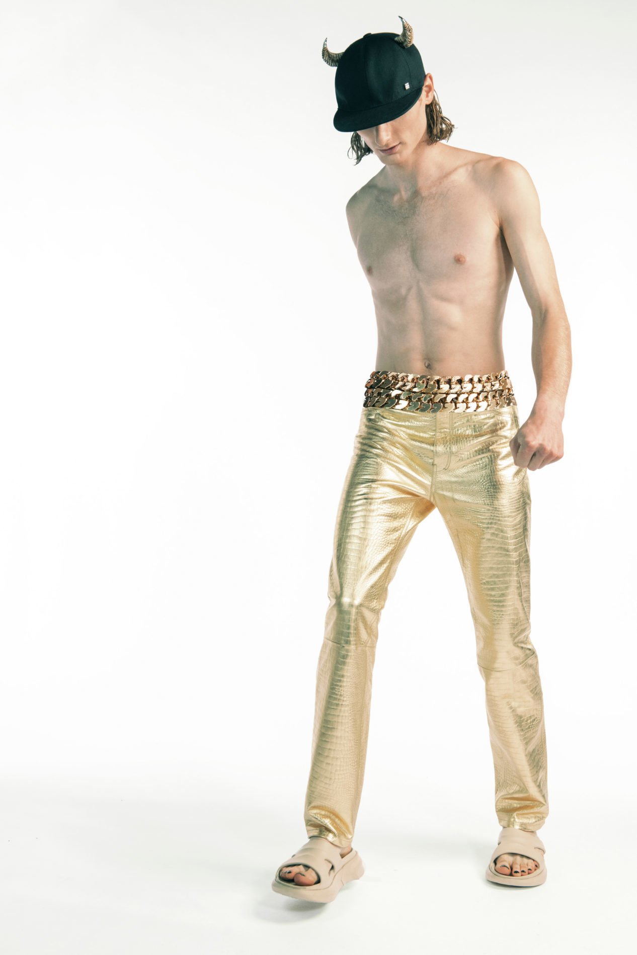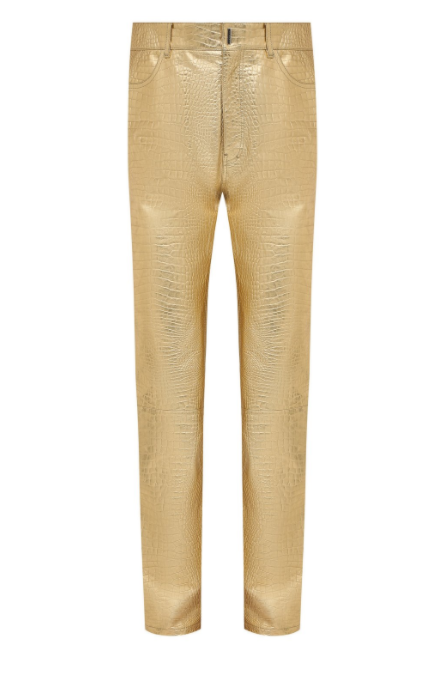 Самая заметная вещь сезона в мужских коллекциях — золотые кожаные брюки Givenchy. За счет сияющего оттенка gold и тиснения под крокодила эта модель — серьезный модный вызов. Чтобы принять его достойно, стоит запомнить: такие брюки согласны исключительно на главную роль в образе. Поэтому остальные слагаемые образы должны лишь подыгрывать — как в примерах ниже.