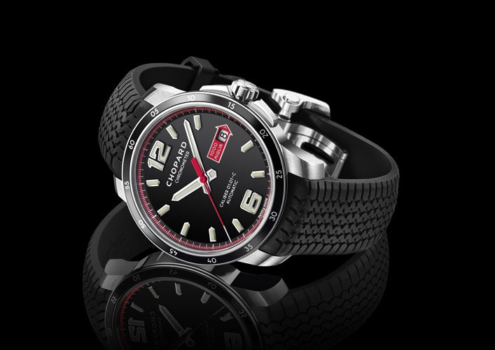 В новых часах Mille Miglia GTS Automatic механизм Chopard 01.01-C с автоматическим заводом обеспечивает 60-часовой запас хода и является сертифицированным хронометром COSC. Он приводит в движение стрелки часов, минут и секунд, а также индикатор даты в положении «3 часа». Корпус часов выполнен из стали или розового золота с черными алюминиевыми вставками. Спортивный стиль модели подчеркивает уникальный резиновый ремешок с рисунком протектора гоночных шин.
