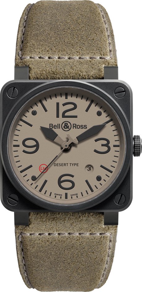 Часовая марка Bell & Ross представила модель BR03-92 Desert Type. Новые часы выпущены лимитированной серией в 250 экземпляров. Автоматический калибр BR-CAL.302 обеспечивает работу часовой, минутной и секундной стрелок, а также указателя даты. Стрелки и часовые метки, расположенные на бежевом циферблате, покрыты фотолюминесцентным покрытием, облегчающим чтение показаний в темноте. 42-миллиметровый корпус из стали с черным PVD-покрытием сохраняет водостойкость на глубине до 100 метров. Новая модель укомплектована бежевым ремешком из искусственно состаренной кожи и ультрапрочной синтетической ткани.