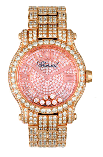 Ювелирно-часовая компания Chopard представила часы Happy Sport, украшенные 1066 бриллиантами. Корпус и браслет новой модели выполнены из розового золота. Автоматический калибр обеспечивает 42-часовой запас хода часовой, минутной и секундной стрелок. 7 бриллиантов классической огранки традиционно для коллекции Happy Diamonds свободно перемещаются между двумя сапфировыми стеклами, расположенными над циферблатом.