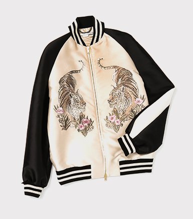 Образ, словно задуманный для стритстайл-хроник: черно-белый бомбер из атласа с контрастной ручной вышивкой в технике Punch Needle, свободная футболка с принтом (привет, логомания) и, конечно же, широкие укороченные джинсы с завышенной посадкой.