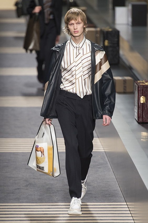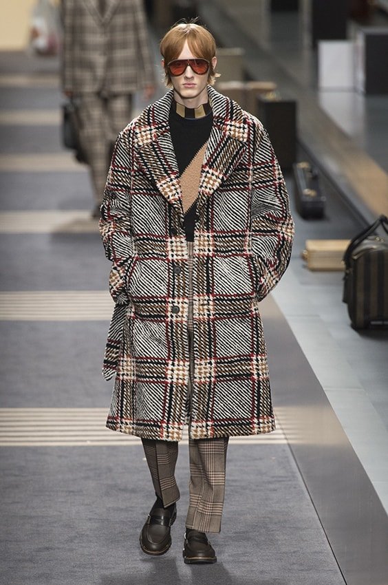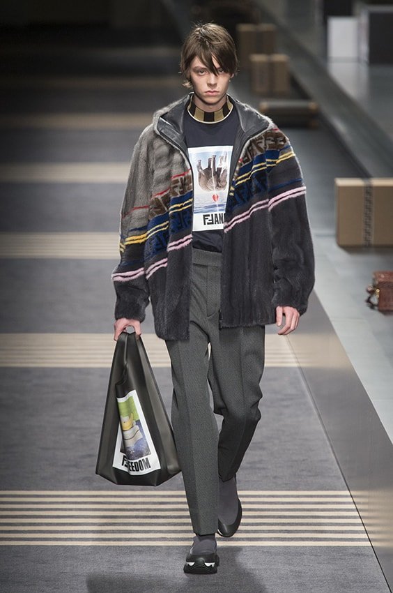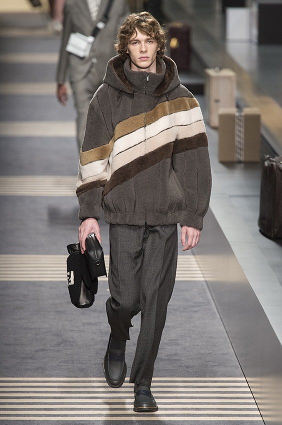 Тяга Карла Лагерфельда каждый показ превращать в шоу с невозможными декорациями известна всем: Grand Palais благодаря его безудержной фантазии пережил уже не одно кардинальное перевоплощение. И хотя за мужскую линию Fendi отвечает целиком Сильвия Вентурини Фенди, за годы сотрудничества с дизайнером она прониклась его подходом к делу. И пространство, где проходил показ новой коллекции итальянского дома, превратилось в аэропорт. Причем со всеми деталями: табло вылетов и прибытий, багажной лентой и траволаторами.