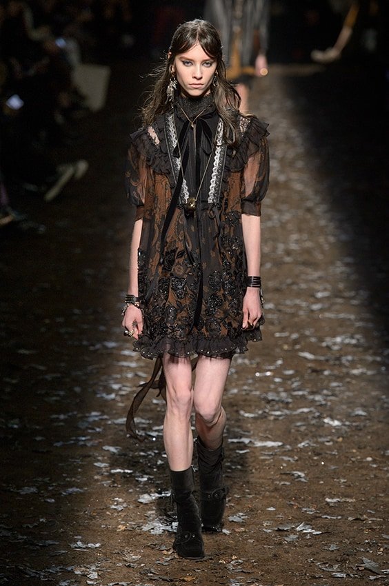 В новом сезоне Виверс заинтересовался темной стороной американской культуры: ужасами и страшилками. Так что подиум превратился в лес, куда отправляются неосторожные подростки. Мрачная цветовая гамма, бохо-силуэты, обилие замши и кудрявого короткого меха, ковбойские детали, смешанные с викторианскими, — всё намекает на то, что подростков в лесу ждет ведьминский ковен.
