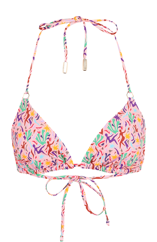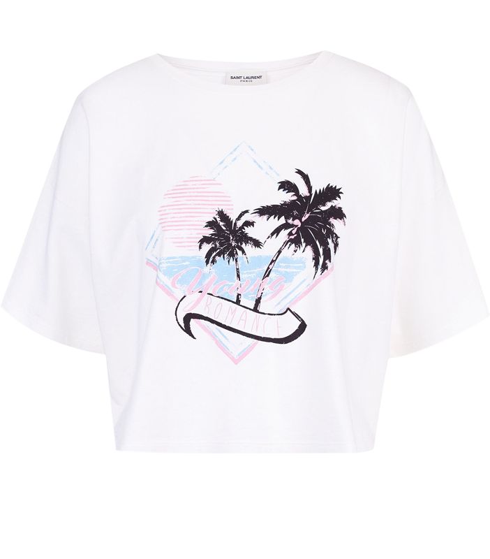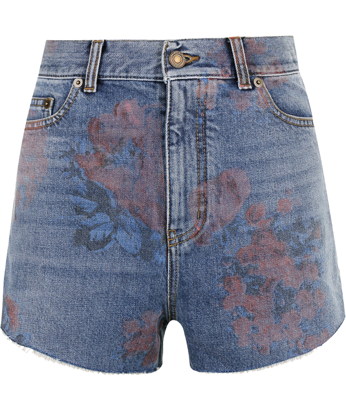 LAZUL, Треугольный бра с контрастным принтом, 9 950 ₽; SAINT LAURENT, Укороченная хлопковая футболка с принтом, 29 600 ₽; SAINT LAURENT, Джинсовые мини-шорты с потертостями, 46 400 ₽; ROBERI & FRAUD, Солнцезащитные очки, 17 500 ₽; MAISON MICHEL, Шляпа с лентой, 42 750 ₽; MARNI, Сумка Tricot, 93 850 ₽
