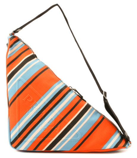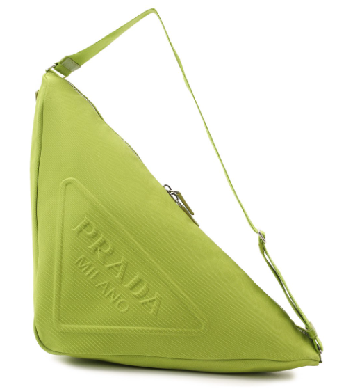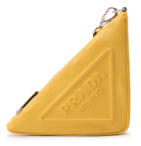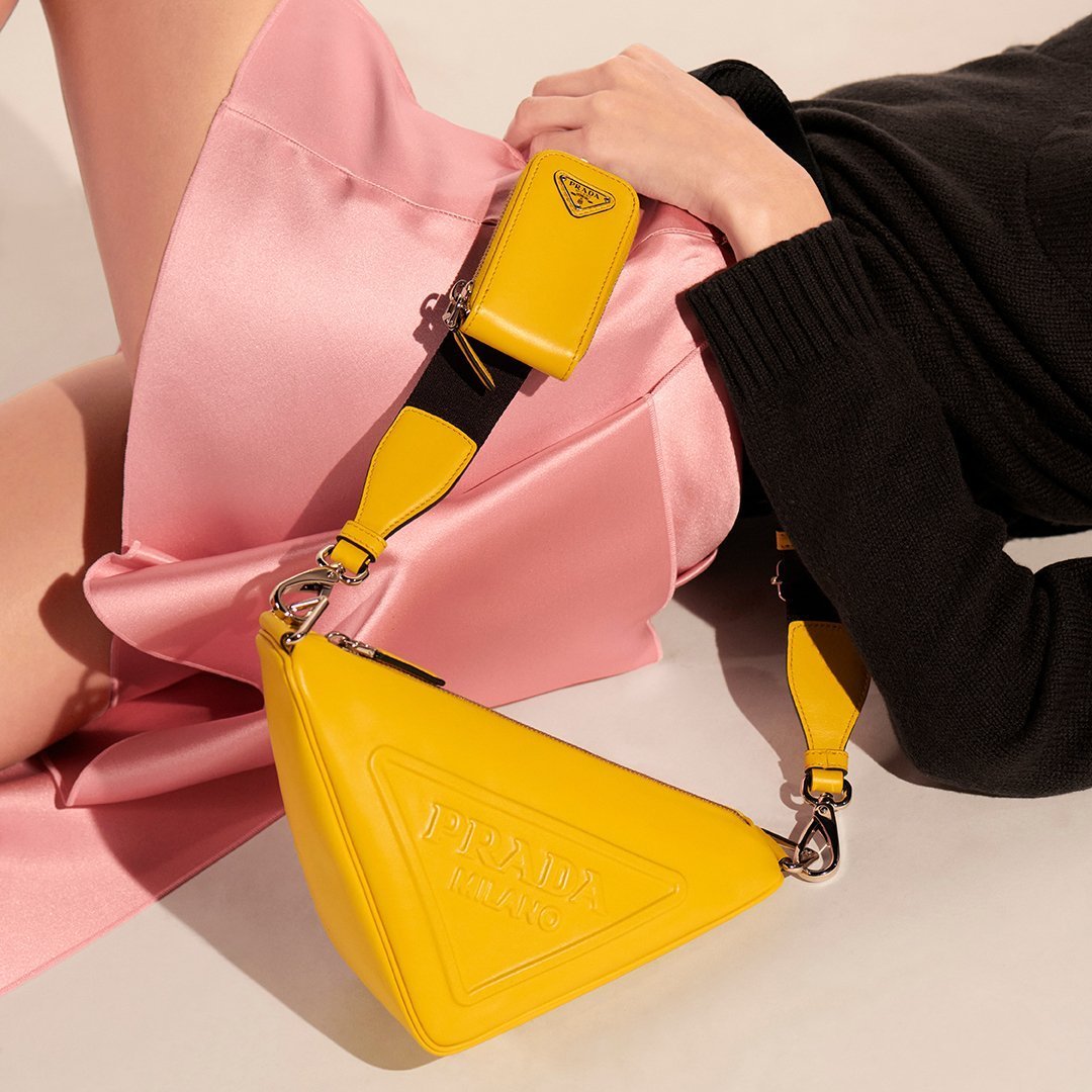 Prada Triangle существует в разных цветах — от классического черного до «солнечного» желтого, тропического оттенка манго и даже оранжево-голубого полосатого принта.