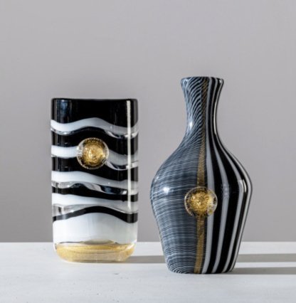 Сегодня общая история Versace и Venini продолжается стараниями Донателлы Версаче. В этом сезоне коллекция Versace x Venini пополнилась лимитированными вазами Gessato и Smoking. Их создавали с помощью fasce — техники, позволяющей добиться смешения разноцветных полос на поверхности стекла. И, конечно, каждую украшает узнаваемый символ Versace — Медуза из сусального золота.