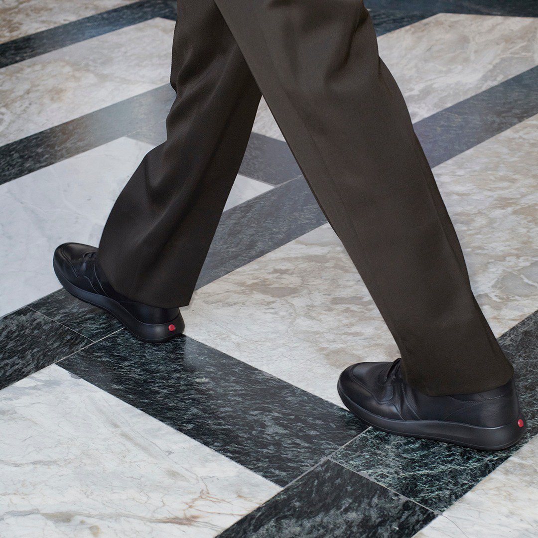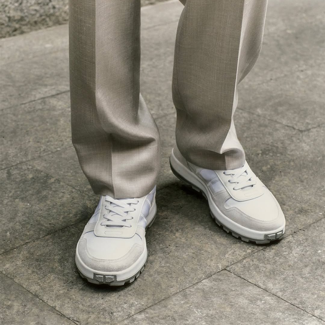 Чтобы спортивная обувь нашла общий язык со строгим низом, она должна быть спокойной расцветки и выглядеть лаконично.
