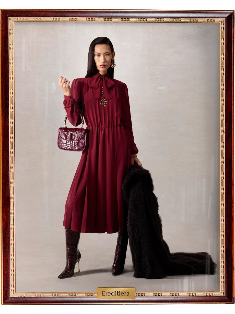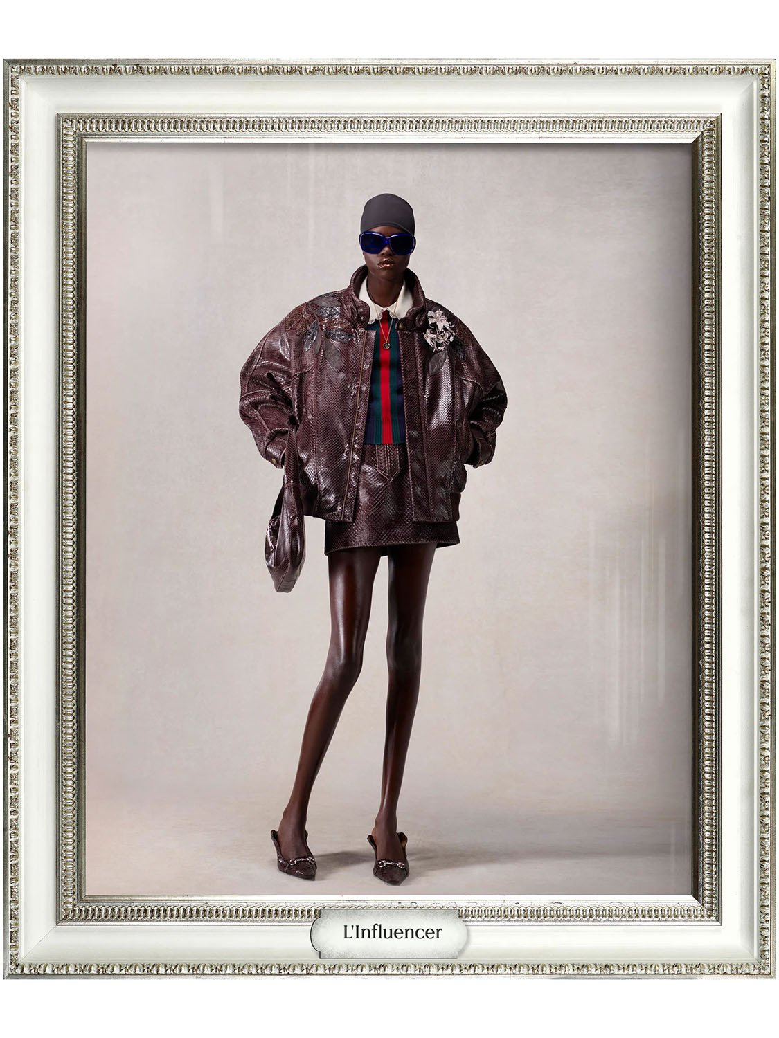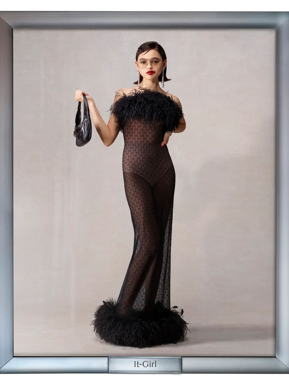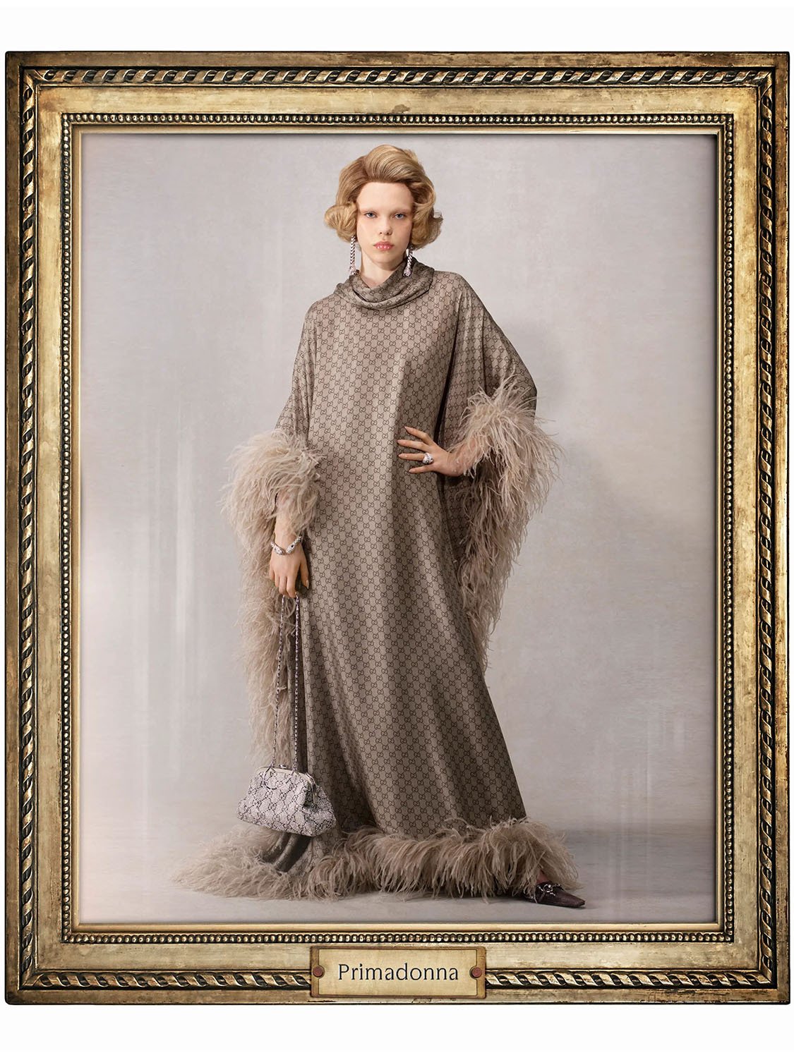 Новый креативный директор Gucci Демна Гвасалия представил свой дебютный лукбук для бренда. В коллекцию весна-лето 2026 под названием La Famiglia вошли как драматичные наряды из кожи, так и вечерние платья в пол с пышным декором перьями. Каждый образ помещен в раму и подписан: «Принцесса», «Инфлюенсер», «Сноб», «Примадонна» и т. д.