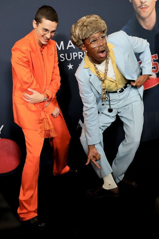 На нью-йоркской премьере актер появился в оранжевом монохромном костюме Tom Ford: двубортный пиджак, шелковая рубашка и шарф в тон создали оглушительно яркий образ. Его мать, Николь Фландер, блистала рядом в платье того же оттенка.