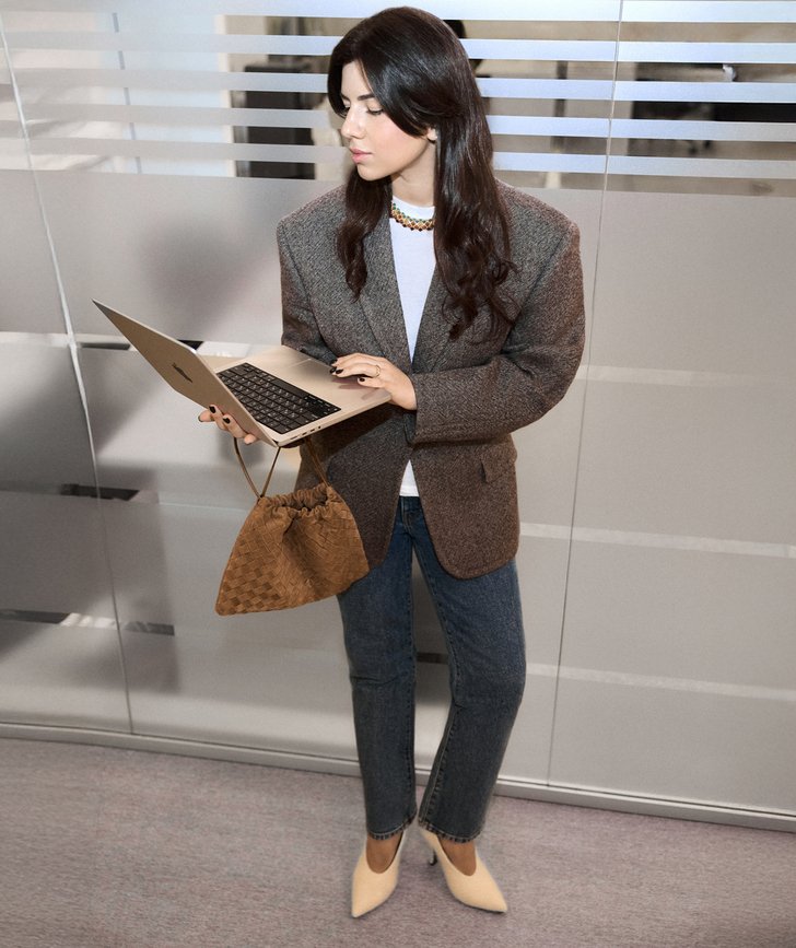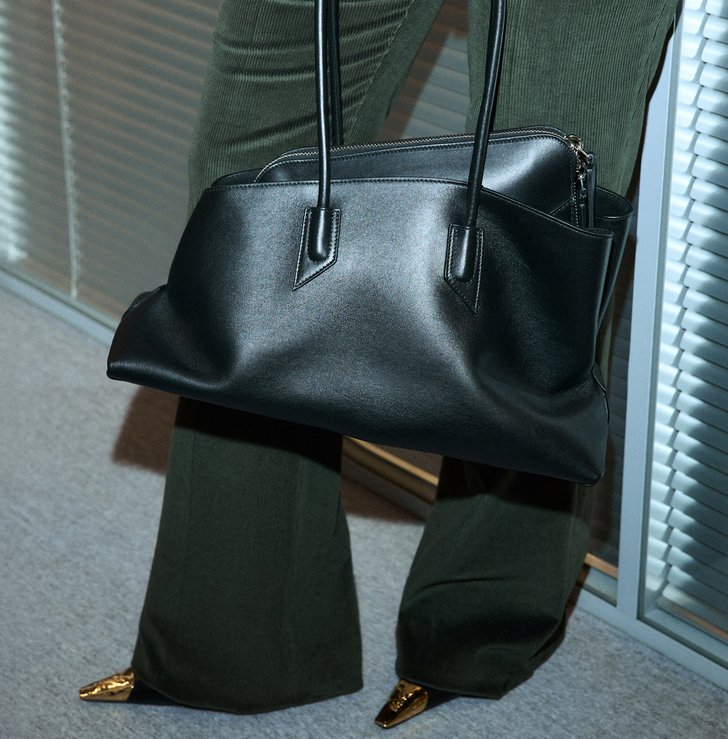 Вместительная сумка, в которую поместятся и ноутбук, и комплект одежды для тренировки после работы. Еще один must-have — туфли Saint Laurent с акцентным мысом. Они способны преобразить даже самый лаконичный наряд.