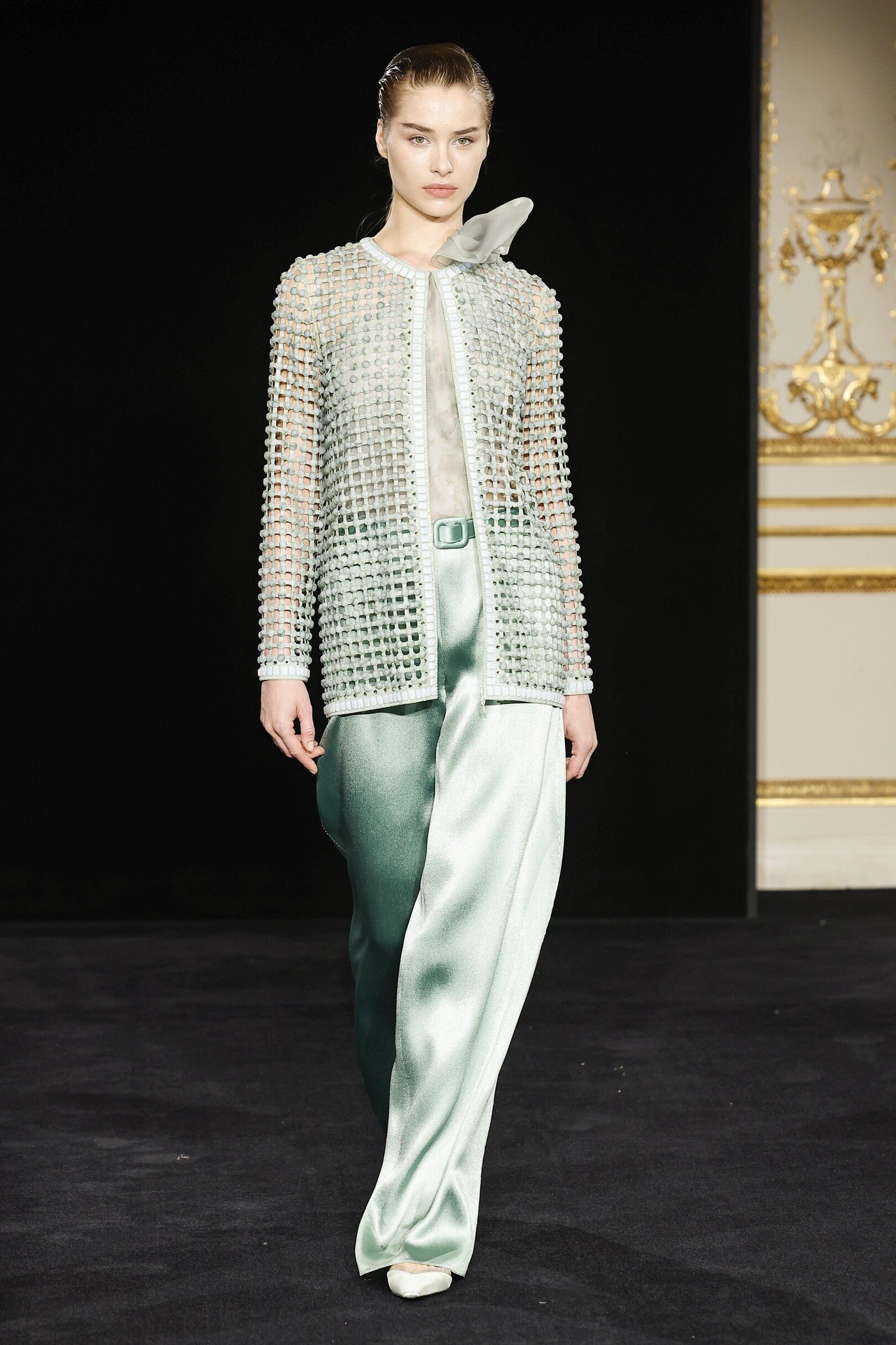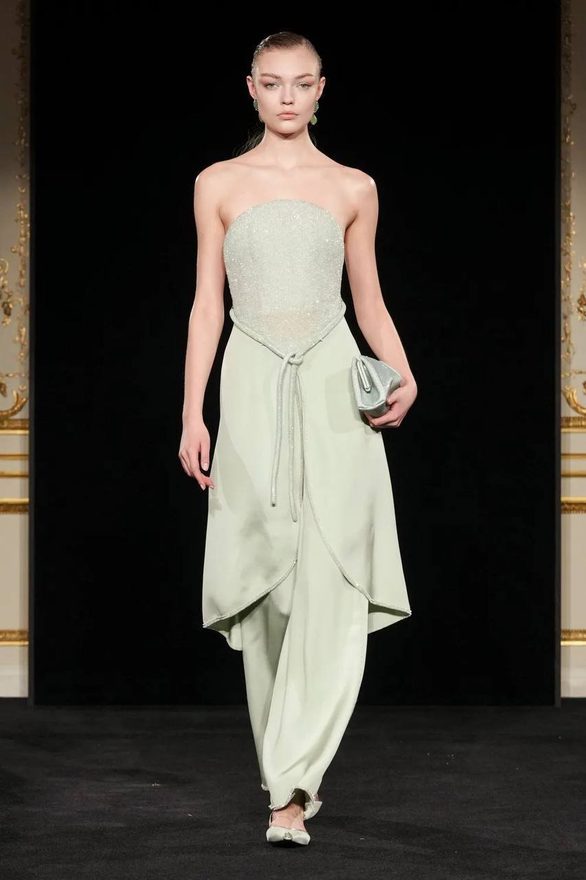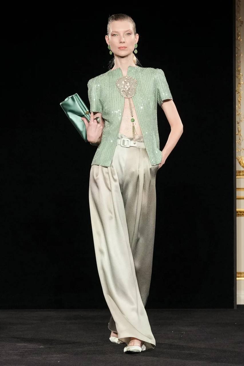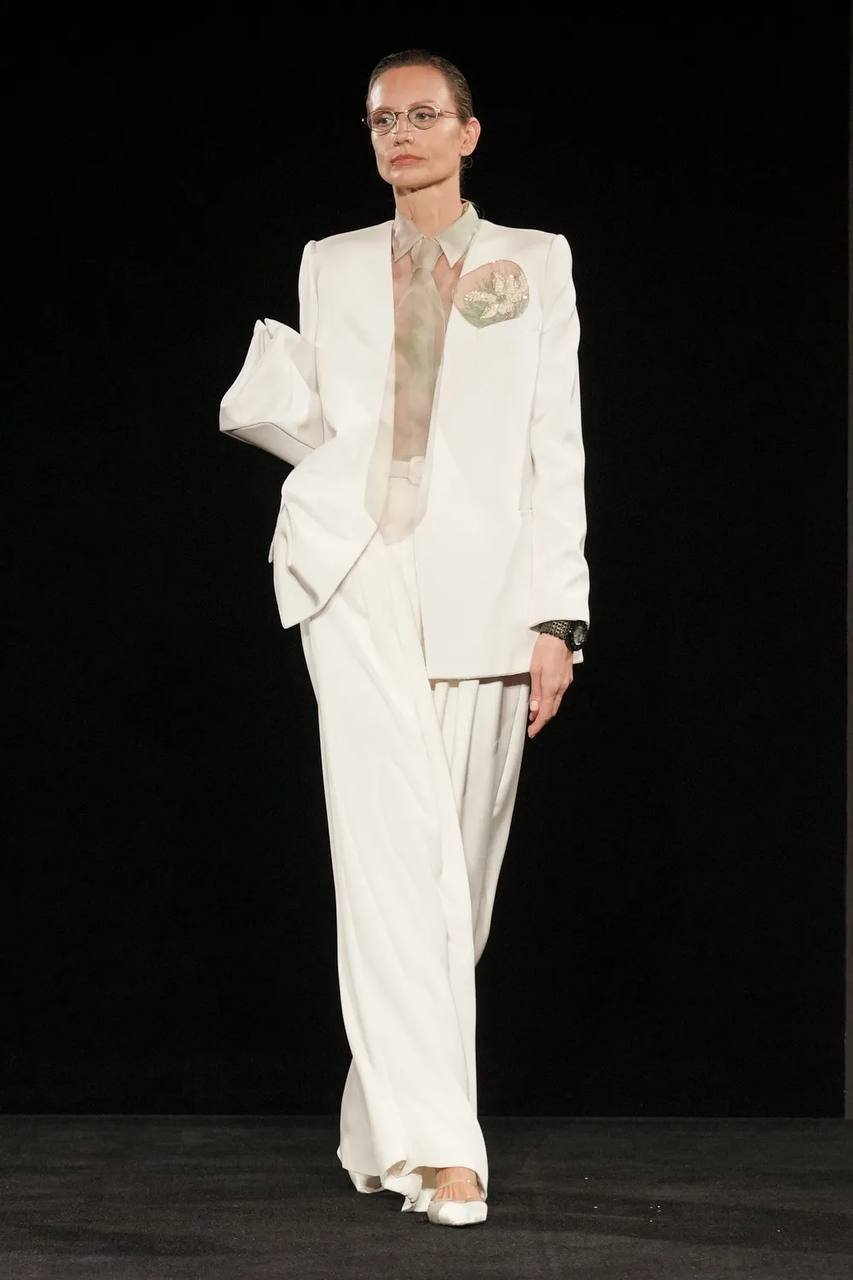 Коллекция получила название «Jade» — в честь редкого минерала жадеита, нежно-бирюзовый оттенок которого стал центральным в палитре. Прохладный, почти эфемерный тон задает интонацию всему показу, раскрываясь в прозрачных шелках, струящихся платьях и невесомых жакетах. Его дополняют приглушенные бежевые, молочно-лиловые и классические черные оттенки, формируя гармоничную, медитативную цветовую партитуру. В этой тишине особенно отчетливо слышна идеология Armani: истинная роскошь не нуждается в громких жестах.