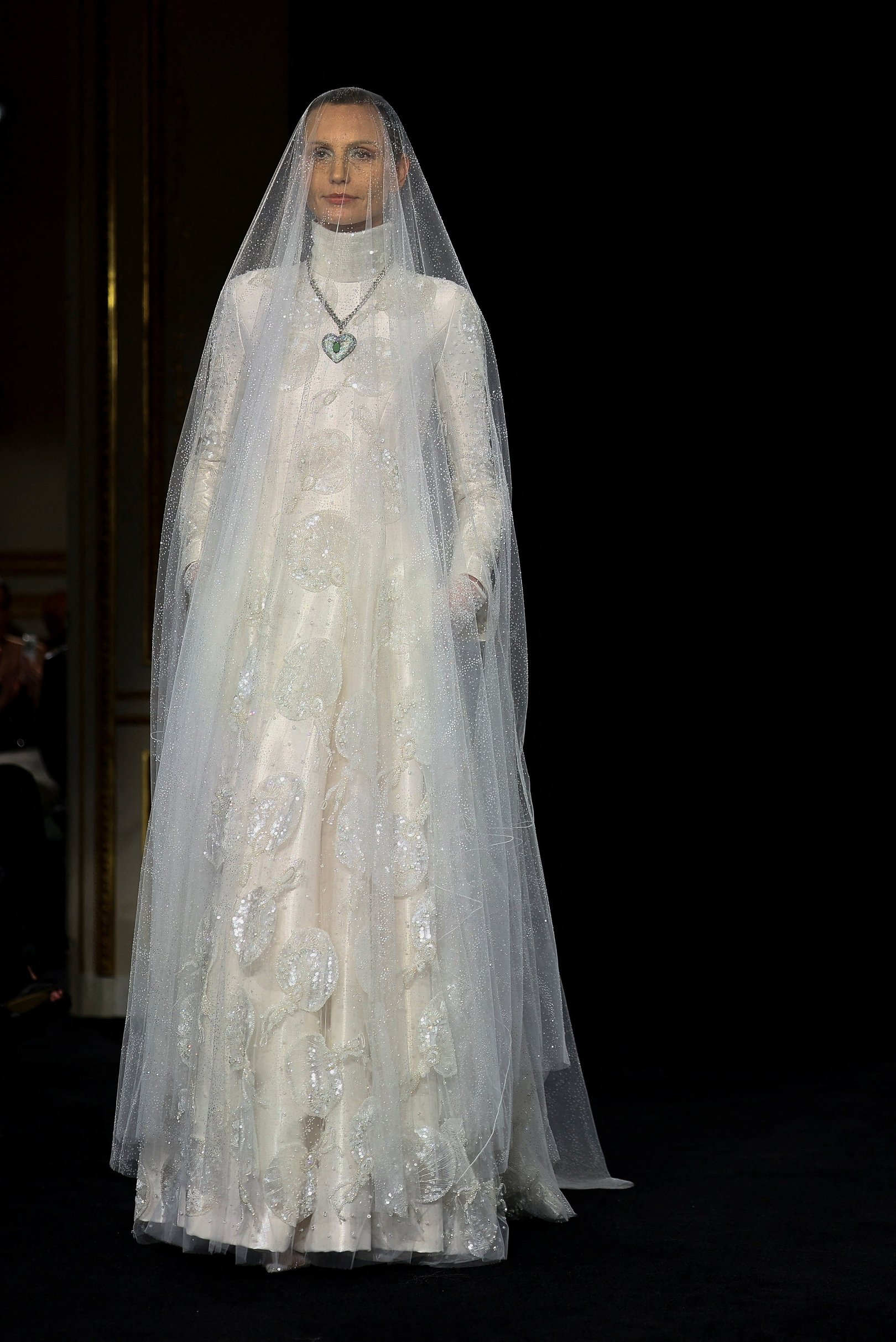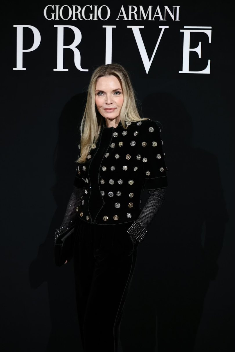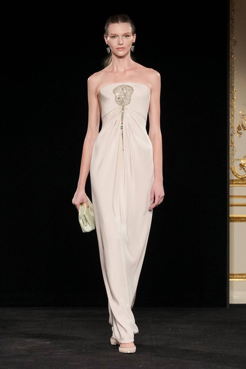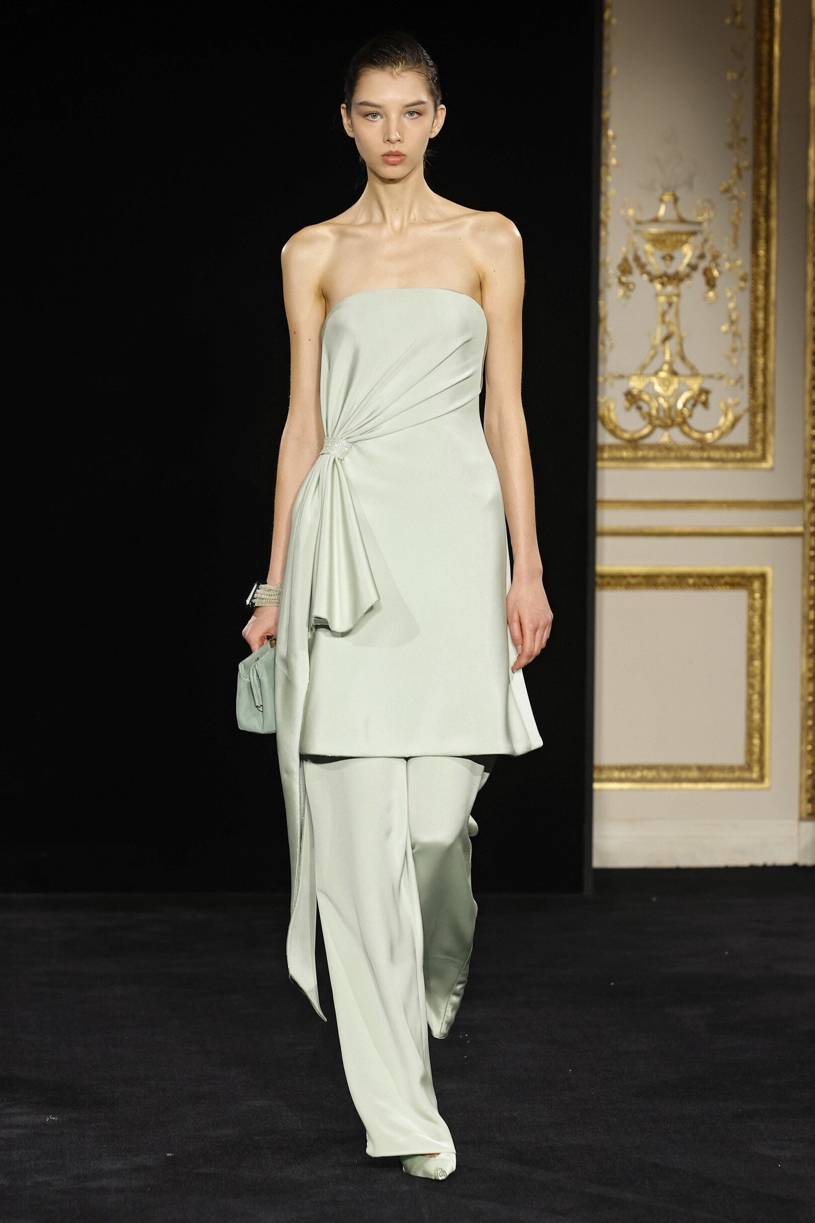 Коллекция получила название «Jade» — в честь редкого минерала жадеита, нежно-бирюзовый оттенок которого стал центральным в палитре. Прохладный, почти эфемерный тон задает интонацию всему показу, раскрываясь в прозрачных шелках, струящихся платьях и невесомых жакетах. Его дополняют приглушенные бежевые, молочно-лиловые и классические черные оттенки, формируя гармоничную, медитативную цветовую партитуру. В этой тишине особенно отчетливо слышна идеология Armani: истинная роскошь не нуждается в громких жестах.