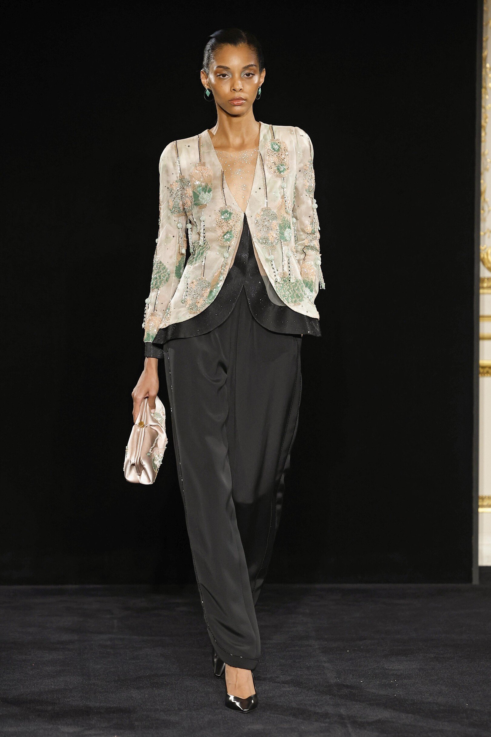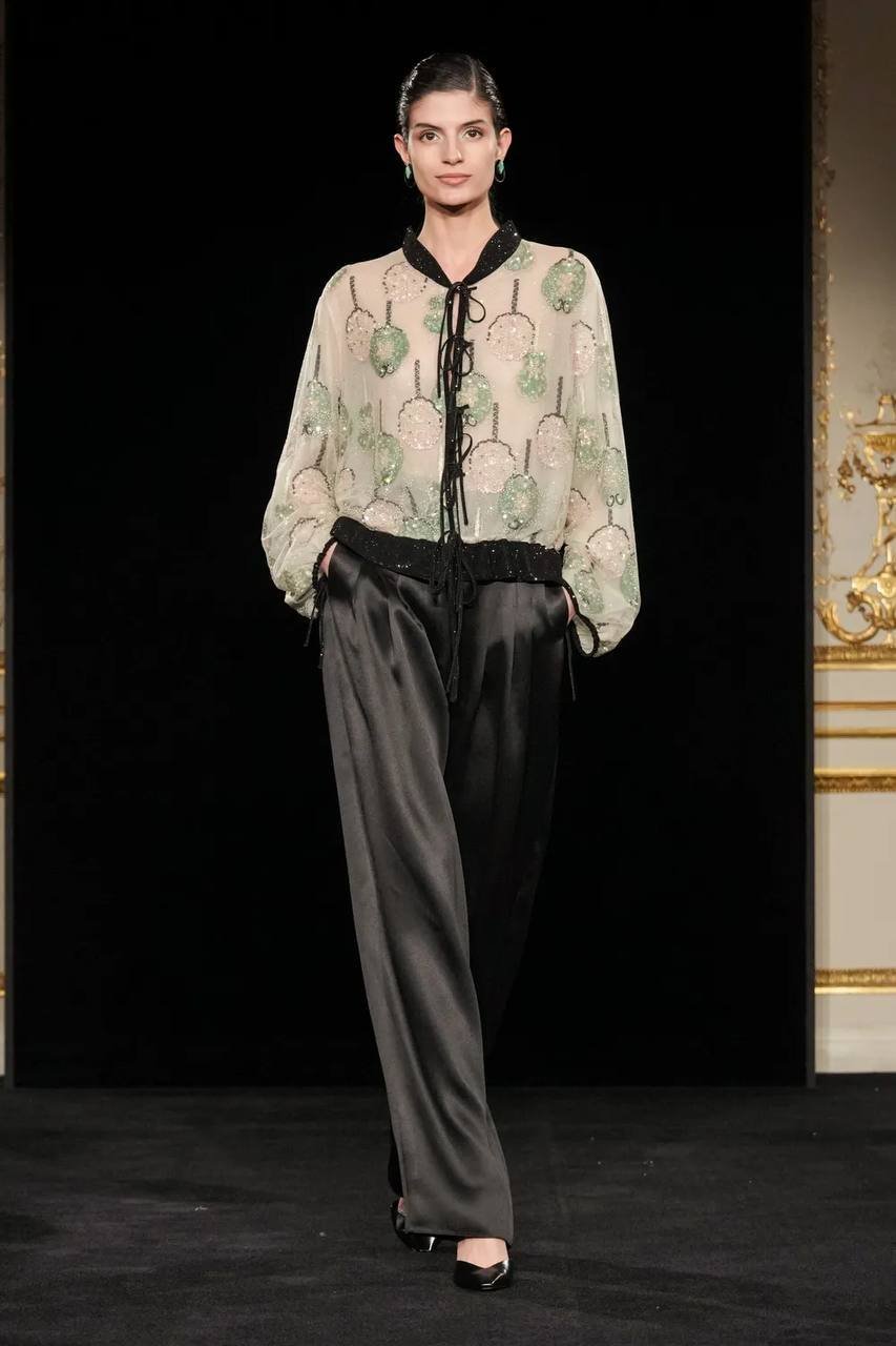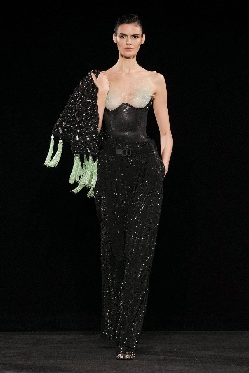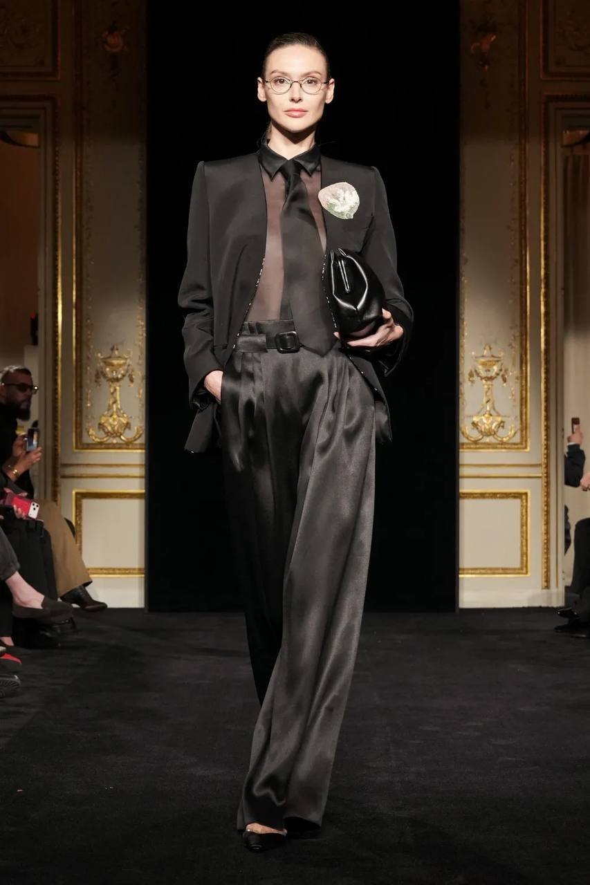 Сильвана Армани обращается к визитной карточке дома — шинуазри, вступая в диалог Востока и Запада. Центральным декоративным мотивом оказывается образ традиционного китайского веера — утива. Его графичный силуэт появляется на прозрачных топах с глубокими V-образными вырезами, корсетах, жакетах и платьях-колоннах, задавая образам тонкую ритмику. Восточная тема развивается и в крое: жакеты, завязанные как кимоно, корсеты в духе поясов-оби и блузы-ципао из полупрозрачного шелка создают сложную, многослойную композицию, лишенную стилизационной прямолинейности.