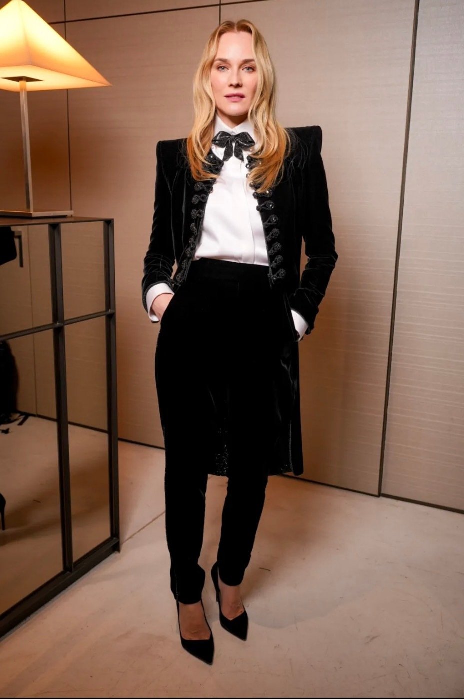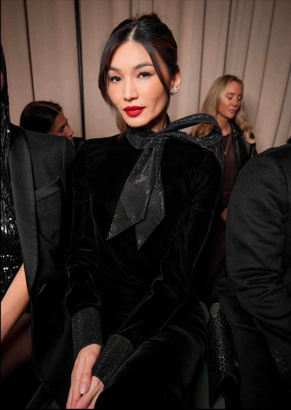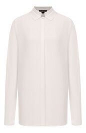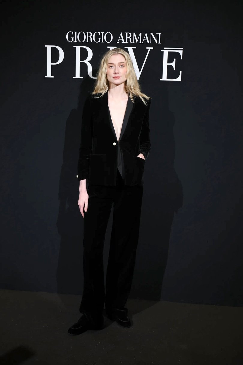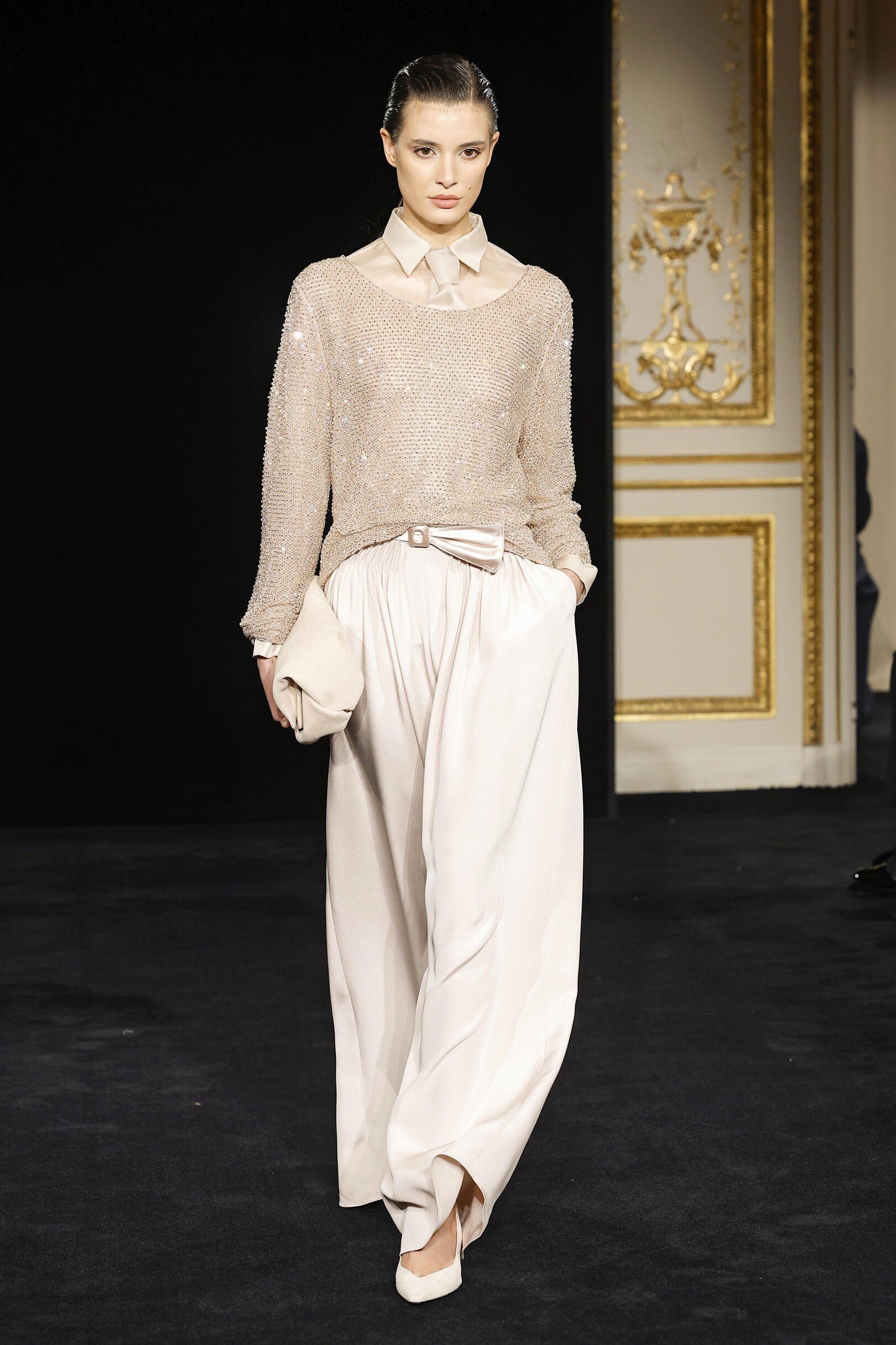 Сильвана Армани обращается к визитной карточке дома — шинуазри, вступая в диалог Востока и Запада. Центральным декоративным мотивом оказывается образ традиционного китайского веера — утива. Его графичный силуэт появляется на прозрачных топах с глубокими V-образными вырезами, корсетах, жакетах и платьях-колоннах, задавая образам тонкую ритмику. Восточная тема развивается и в крое: жакеты, завязанные как кимоно, корсеты в духе поясов-оби и блузы-ципао из полупрозрачного шелка создают сложную, многослойную композицию, лишенную стилизационной прямолинейности.