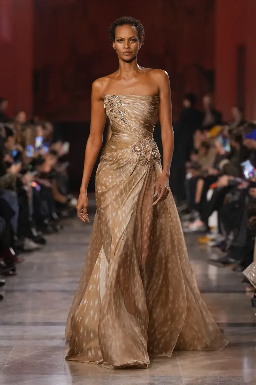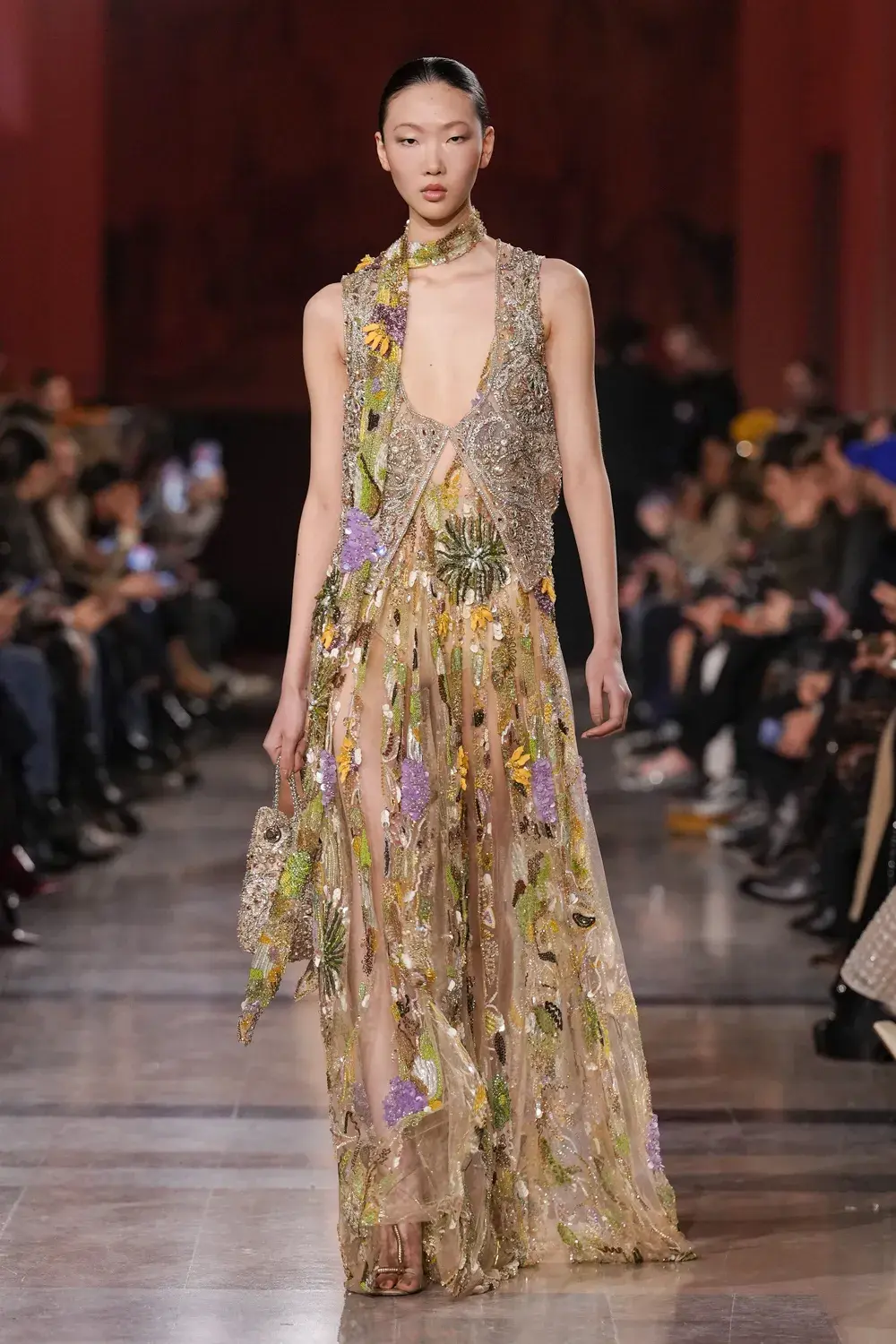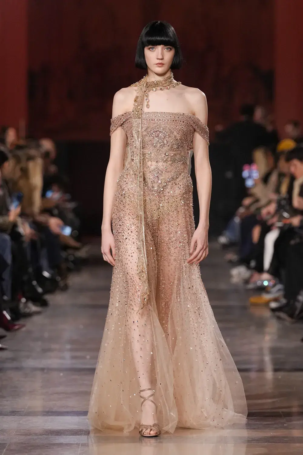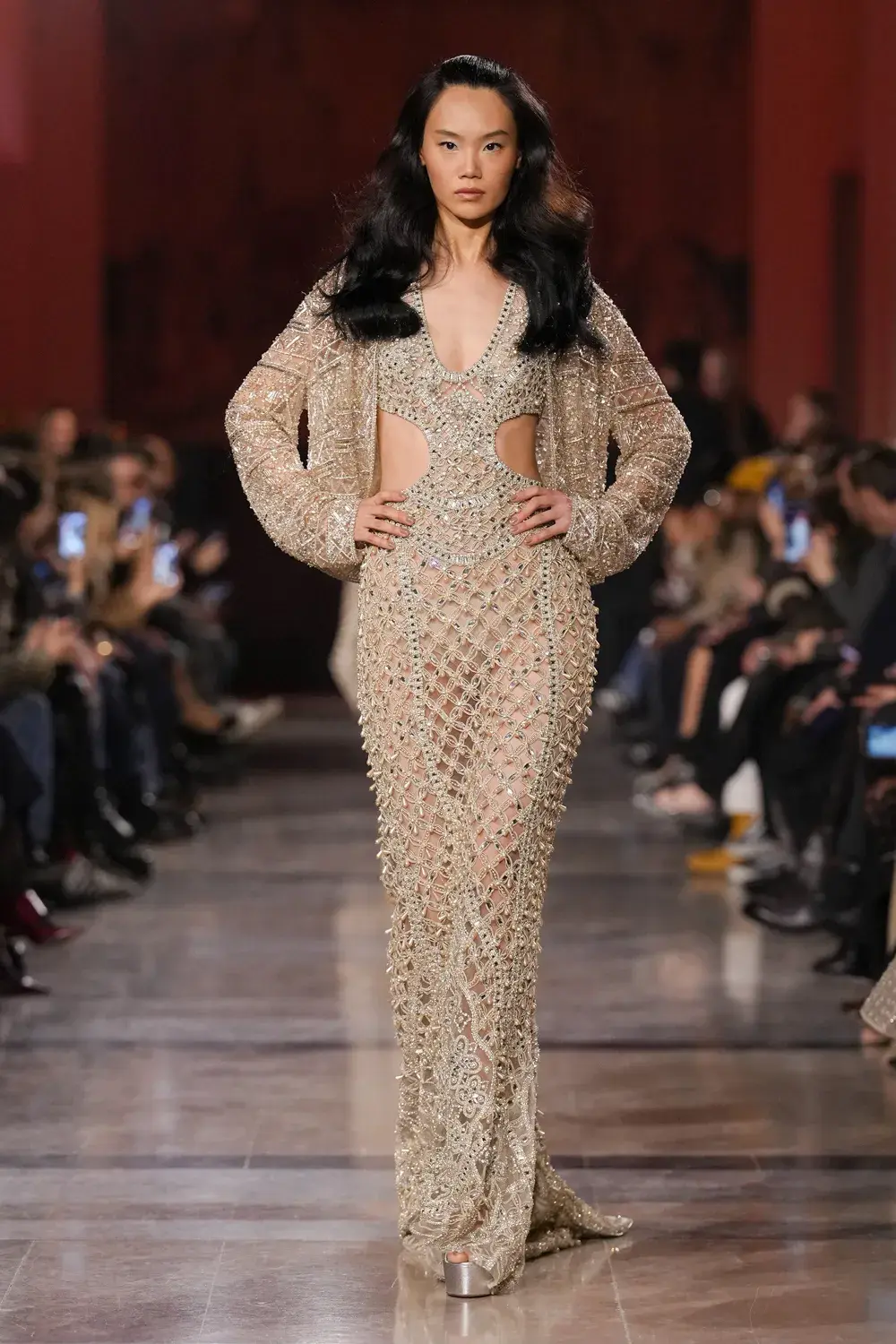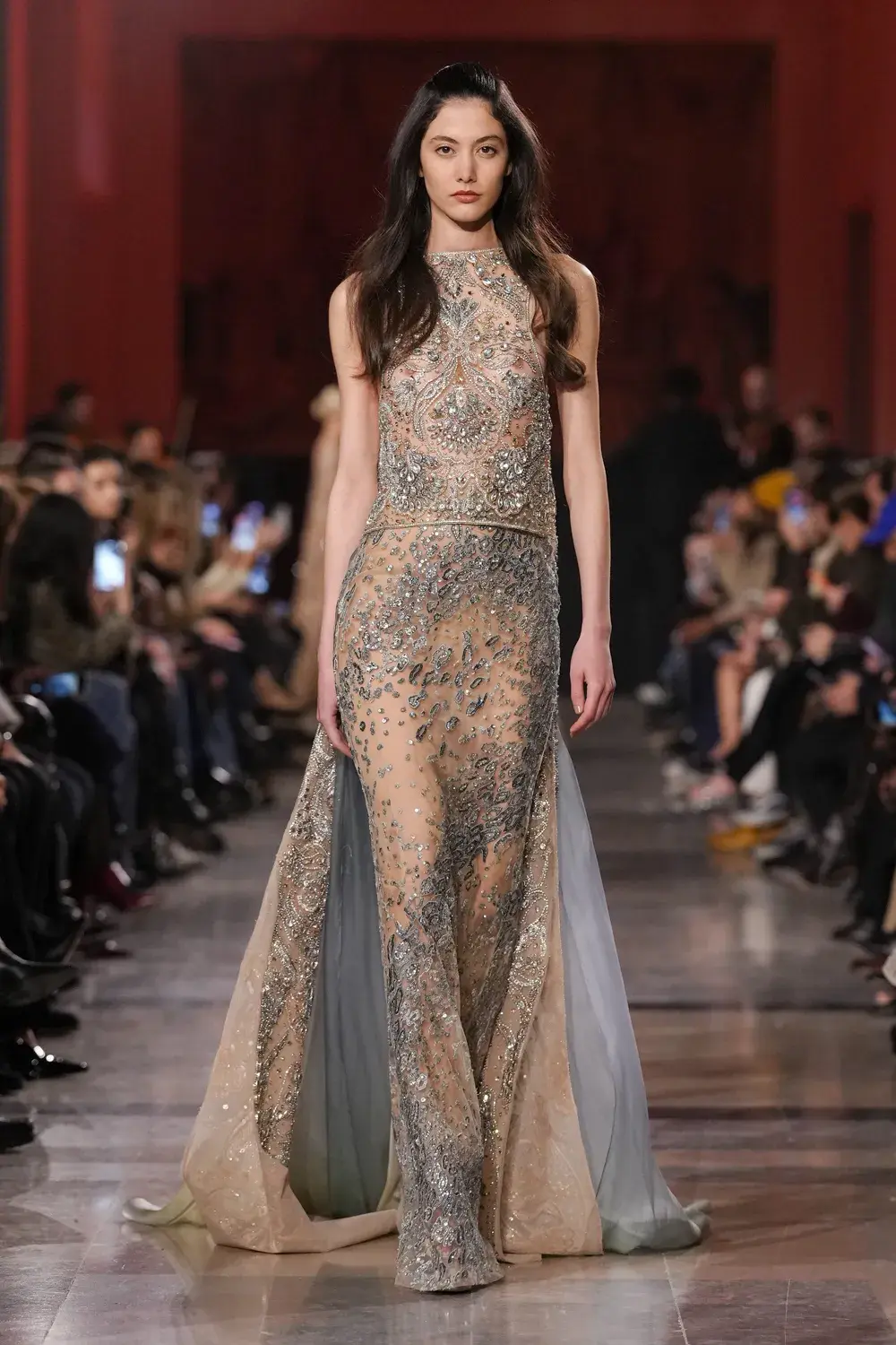 Показ Elie Saab Haute Couture весна–лето 2026 стал демонстрацией утонченной силы, в которой привычная романтическая эстетика дома обрела более радикальный характер. Коллекция строится на четких, архитектурных силуэтах: корсетные лифы, вытянутые линии, подчеркнутые плечи и драматичные шлейфы рисуют образ женщины, одновременно чувственной и властной.