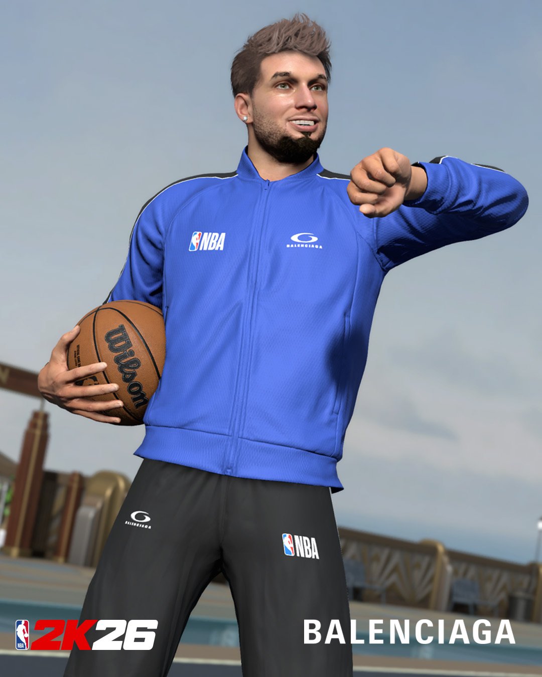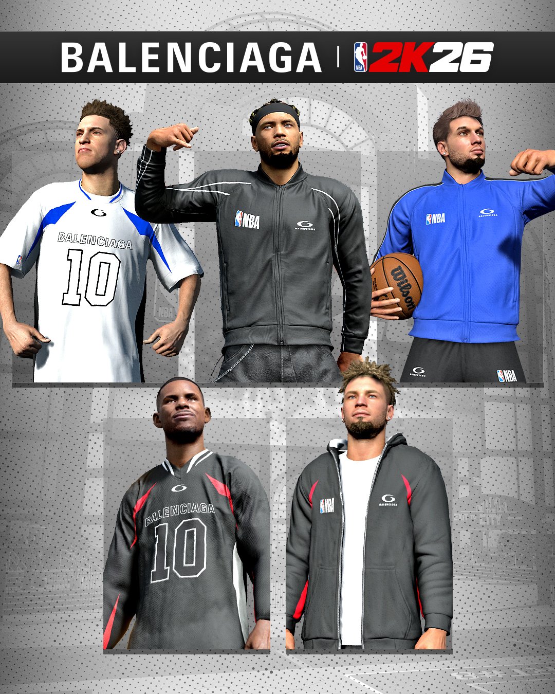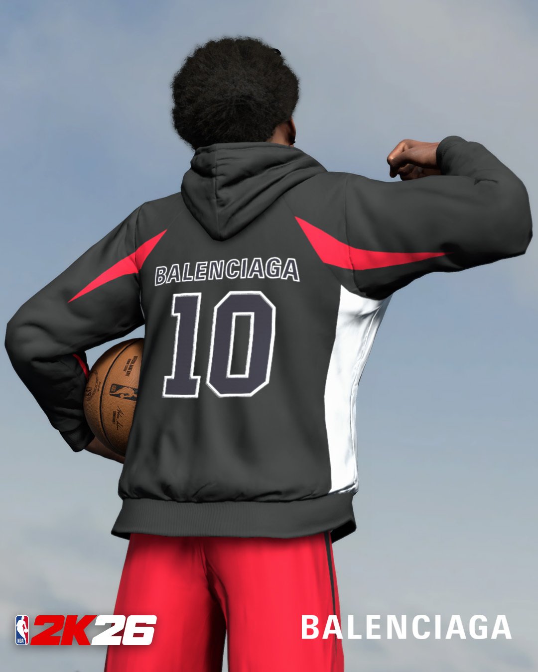 Виртуальный гардероб соткан из узнаваемых кодов Balenciaga: оверсайз-силуэты, тренерские куртки, спортивные костюмы, худи на молнии. Палитра цитирует знаковый логотип NBA — электрический синий, алый и белый — и дополняется фирменным черным Balenciaga.