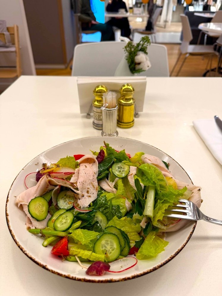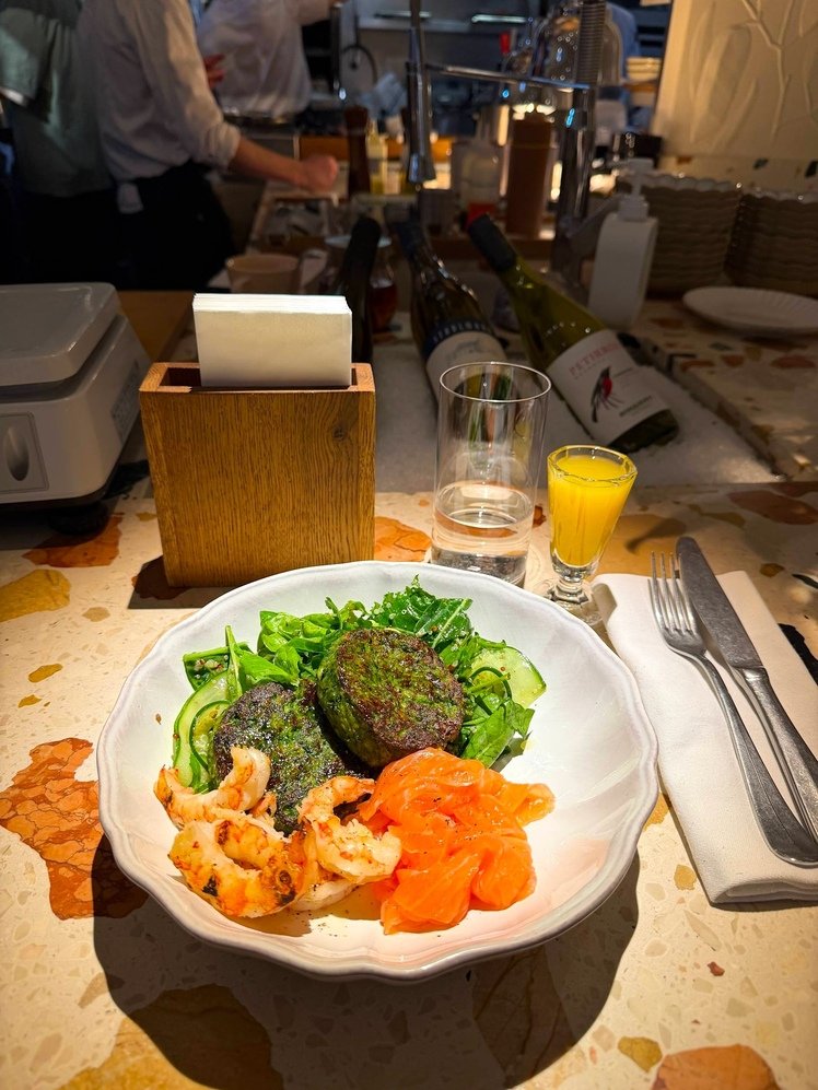 Завтракаю примерно одним и тем же. Половина тарелки — это зеленые или белые овощи и много салата; протеин — рыба, яйца; немного углеводов — хлебец из семян или безглютеновый хлеб. Иногда вместо салата ем зеленые оладьи, если есть время заехать в Margarita Bistro.