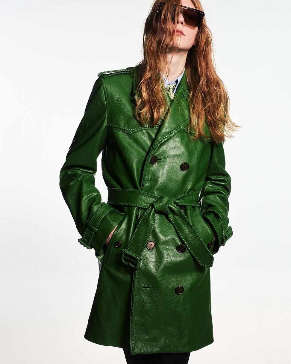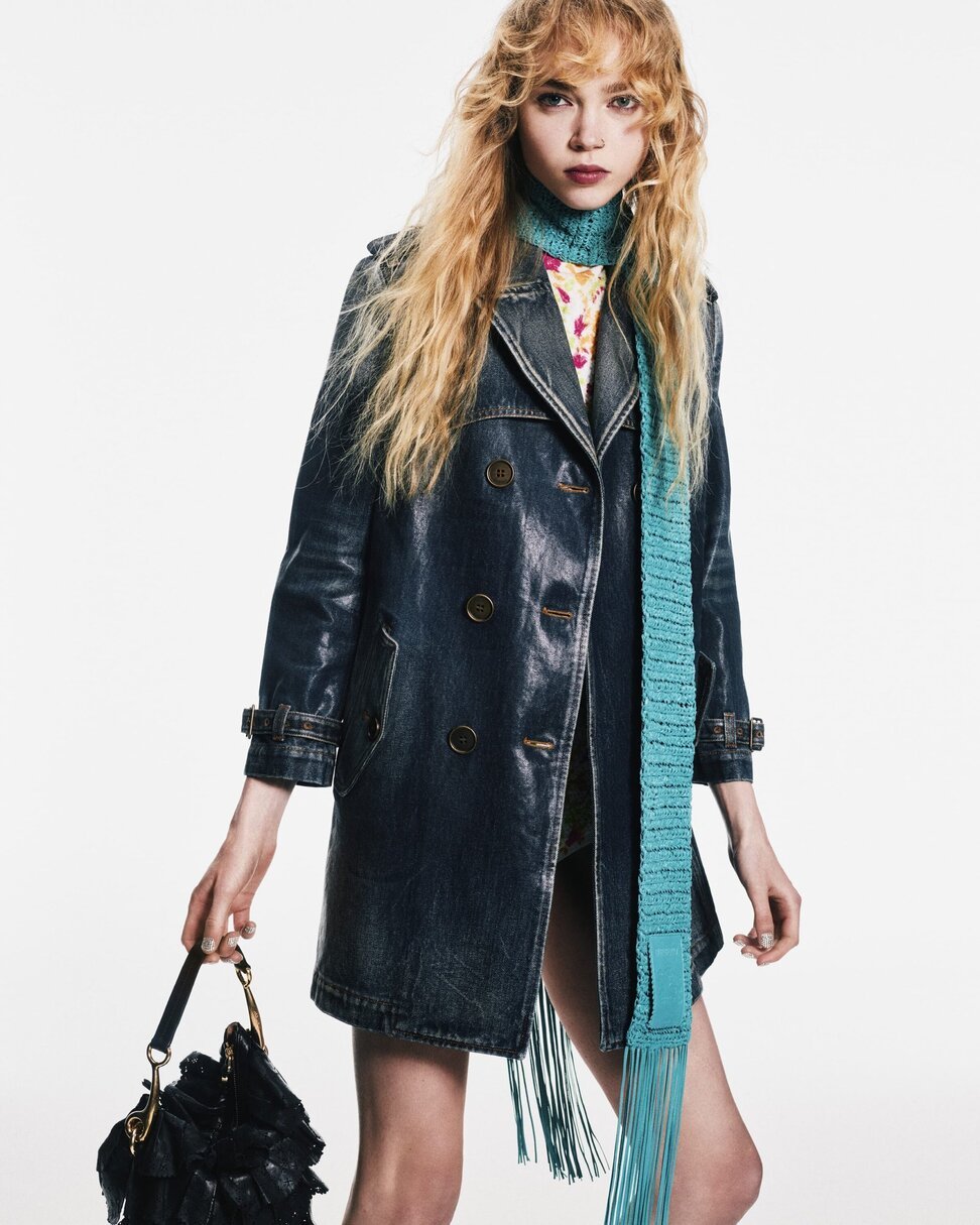 Камертон коллекции — Твигги. В кожаном тренче с каскадом бахромы модель транслирует ту исключительную аутентичность, определяющую британский стиль. Графичная динамика декора в такт ее шагам задает ритм коллекции.