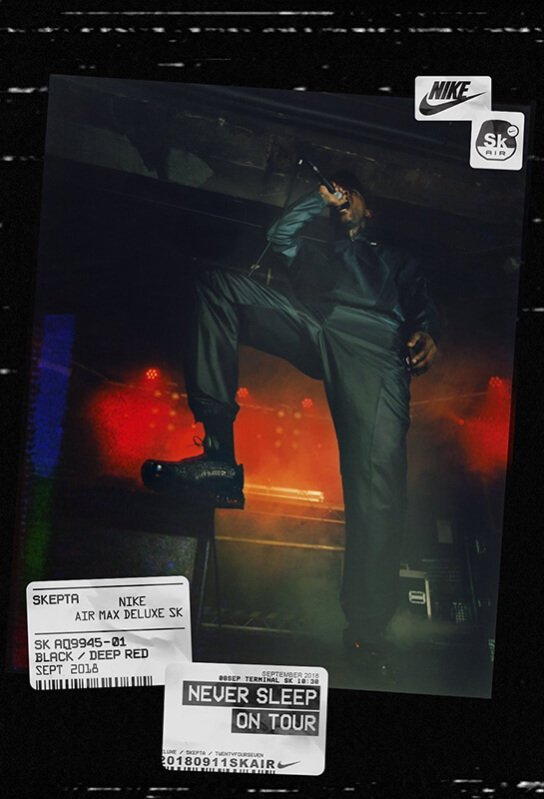 Эта модель создана на основе другой классической пары Nike Air Max Deluxe, а надпись Never Sleep on Tour отсылает к образу жизни и стилю Skepta.