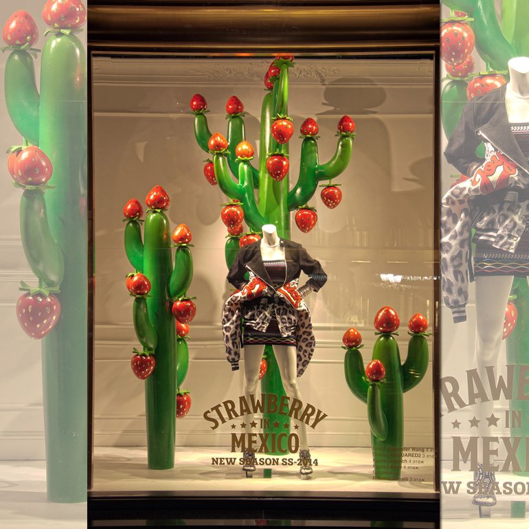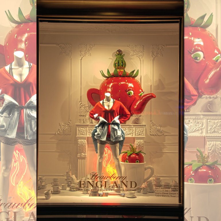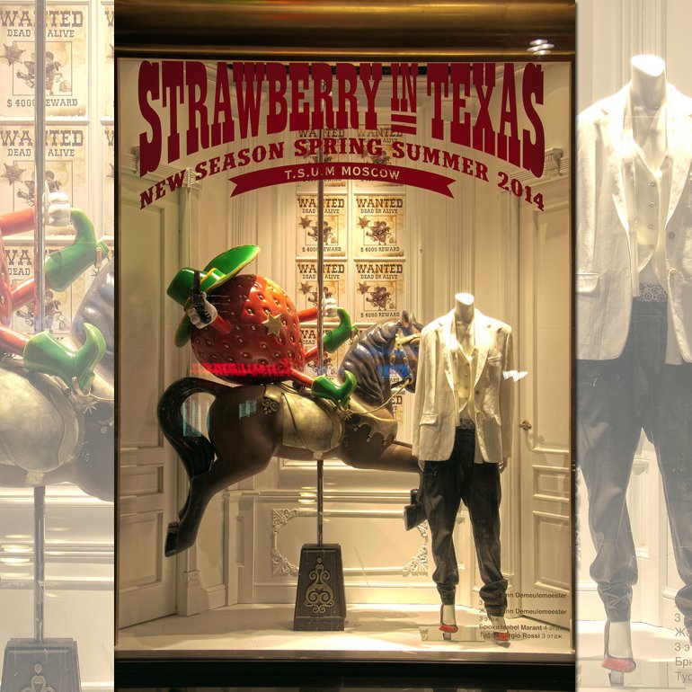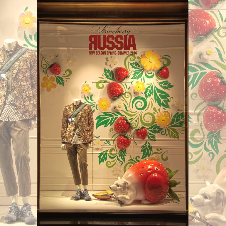 Героиней модного путешествия стала яркая и сочная Клубника — символ летнего отдыха. Она кокетливо «позирует» в витринах ЦУМа и приглашает в Великобританию на five o’clock с мамой-чайником и ее малышом. Или, внезапно оказавшись среди кактусов, ощутить жару Мексики. Витрина в стиле Дикого Запада с Клубникой-ковбоем на коне переносит нас в Техас. И, естественно, дизайнеры не забыли и о России. На этот раз героем витрины стал клубничный медведь с балалайкой на фоне образцов русско-народного творчества. Также креативный отдел ЦУМа интересно стилизовал манекены, одев их в коллекции ведущих мировых брендов.