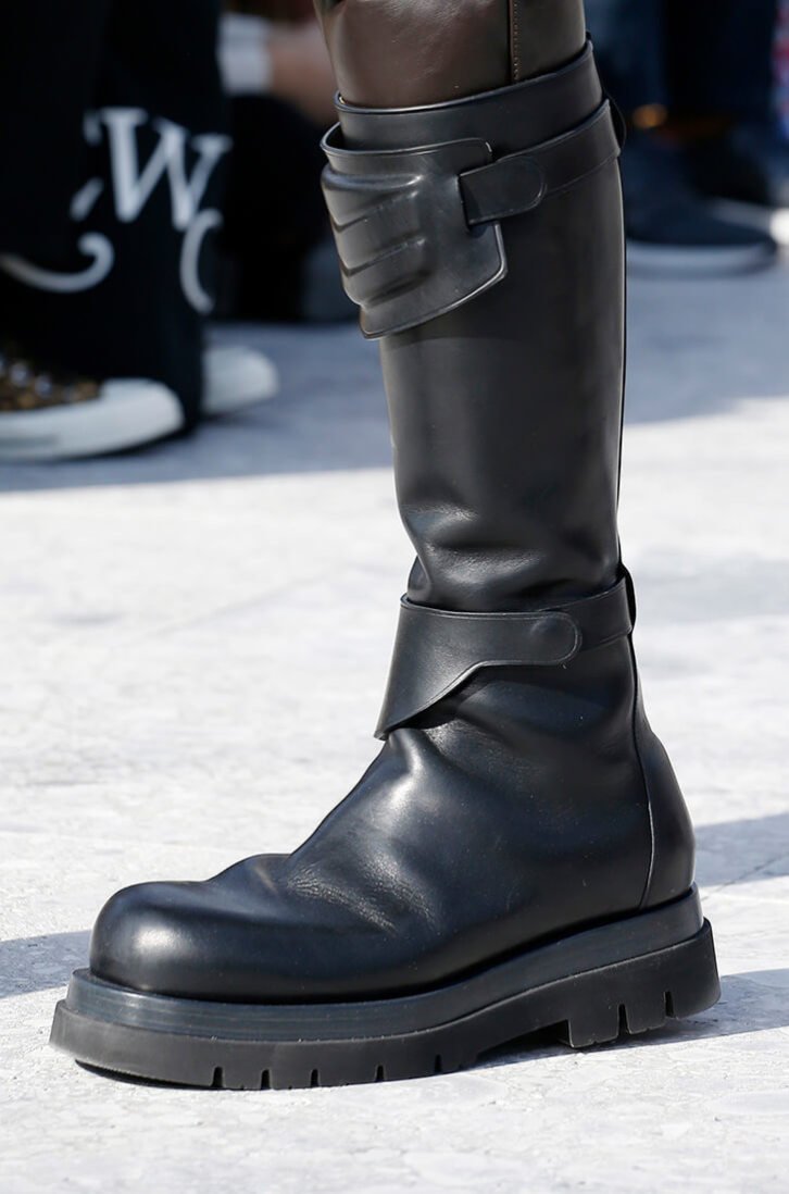 Продолжили тему высокие грубые ботинки и кожаные брюки со вставками, которые можно легко представить на любителях больших скоростей. Кстати, в определенных образах Дэниел Ли практически полностью повторил экипировку мотоциклистов с поправкой на Sci-Fi-эстетику и футуристичные мотивы.