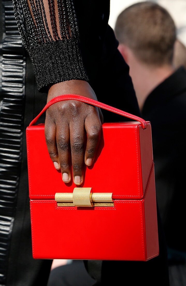 Линия сумок также прошла своеобразную «перезагрузку». Фавориты — модель в форме объемной трапеции и сумки-квадраты черных и красных цветов с золотой застежкой.
