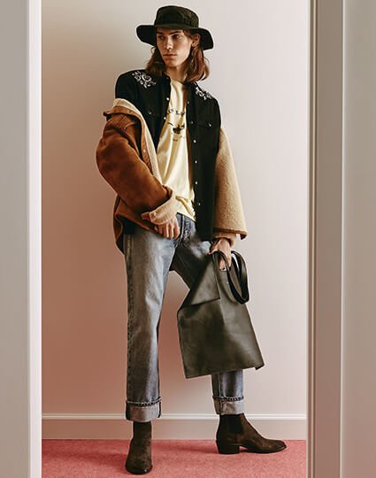 Дубленка, Ralph Lauren, 214 000 руб., рубашка, Saint Laurent, 72 950 руб., футболка, Saint Laurent, 24 400 руб., джинсы, Ralph Lauren, 11 450 руб., ботинки, Givenchy, 62 350 руб., сумка, Alexander McQueen, 97 800 руб., шляпа, Ralph Lauren, 16 400 руб.