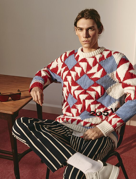 На Саше: пуловер, Tom Ford, 76 500 руб., рубашка, Dries Van Noten, 20 650 руб., брюки, Bottega Veneta, 39 950 руб., кеды, H`D`S`N Baracco, 21 450 руб., браслет, Alexander McQueen, 13 650 руб.
