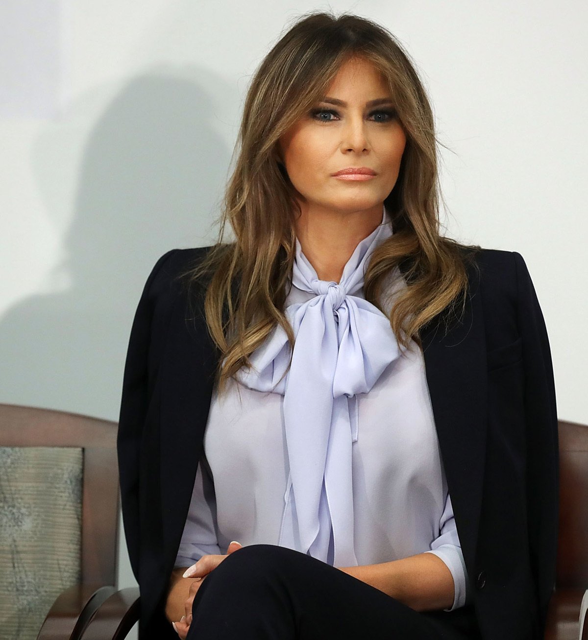 Первая леди США носит блузы с бантом на манер Маргарет Тэтчер — застегнутыми под горло в дуэте с деловым костюмом или брюками в тон.