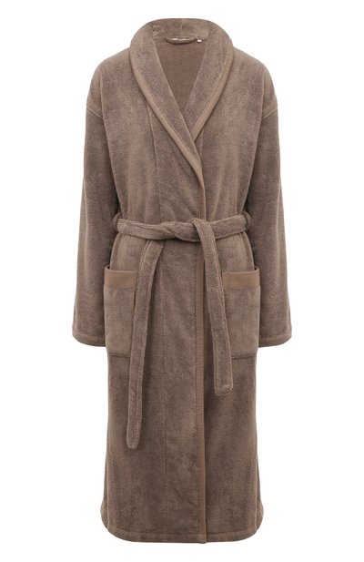 Коричневый халат сшили из приятного на ощупь махрового материала. Для его производства использовали отборный хлопок ценных сортов, поэтому такой текстиль отлично впитывает влагу и быстро сохнет. Отделку выполнили из ткани схожего оттенка. Модель с шалевым воротником дополнили накладными боковыми карманами. Съемный пояс регулирует глубину запаха.