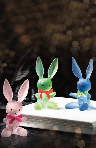 Для создания скульптуры Pin Pin авторства Сержа Мансо мастера Daum использовали авторскую технику работы с хрусталем pate de verre. Цветные осколки, которые называют тестом из стекла, сплавили в огнеупорной форме. Фигура кролика с контрастным бантом станет милым акцентом в интерьере.