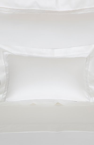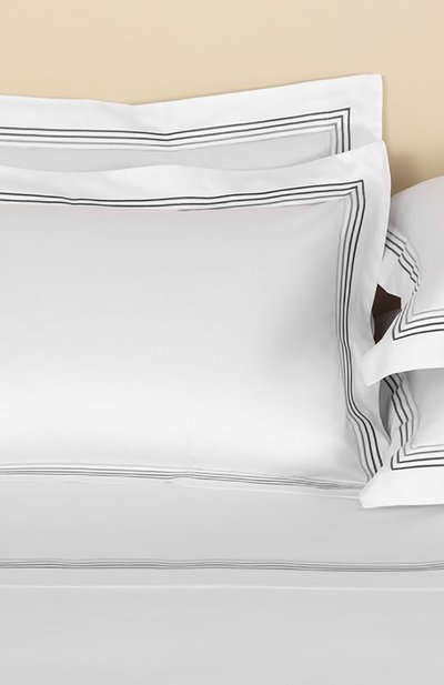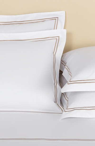 Ключевое требование, предъявляемое к постельному белью, – тонкий материал, который не вызывает аллергию. Например, эту белоснежную квадратную наволочку выполнили из мягкого хлопкового сатина. Роль декора отвели объемному полосатому узору, вышитому шелковистыми нитями нескольких оттенков бежевого.