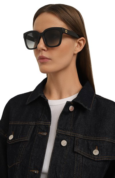 Для производства очков с дымчатыми градиентными линзами Алессандро Микеле выбрал гладкий прочный ацетат, который делает аксессуар с цельными носоупорами почти невесомым. GG-монограмма на оправе формы cat eye рифмуется с фирменным изображением пчелы на левой дужке.