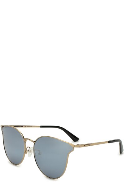 Легкая золотистая оправа солнцезащитных очков изготовлена из легкого полированного металла. Модель формы cat eye дополнена серыми зеркальными линзами, блокирующими 100% ультрафиолетового излучения. Широкие дужки, одна из которых украшена рельефным логотипом бренда, дополнены заушниками из черного гладкого ацетата.